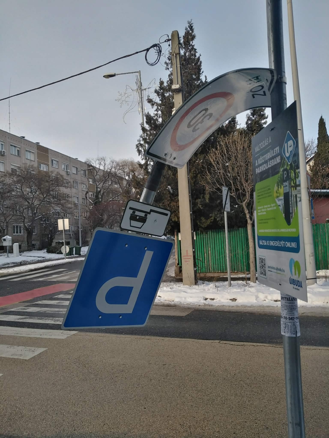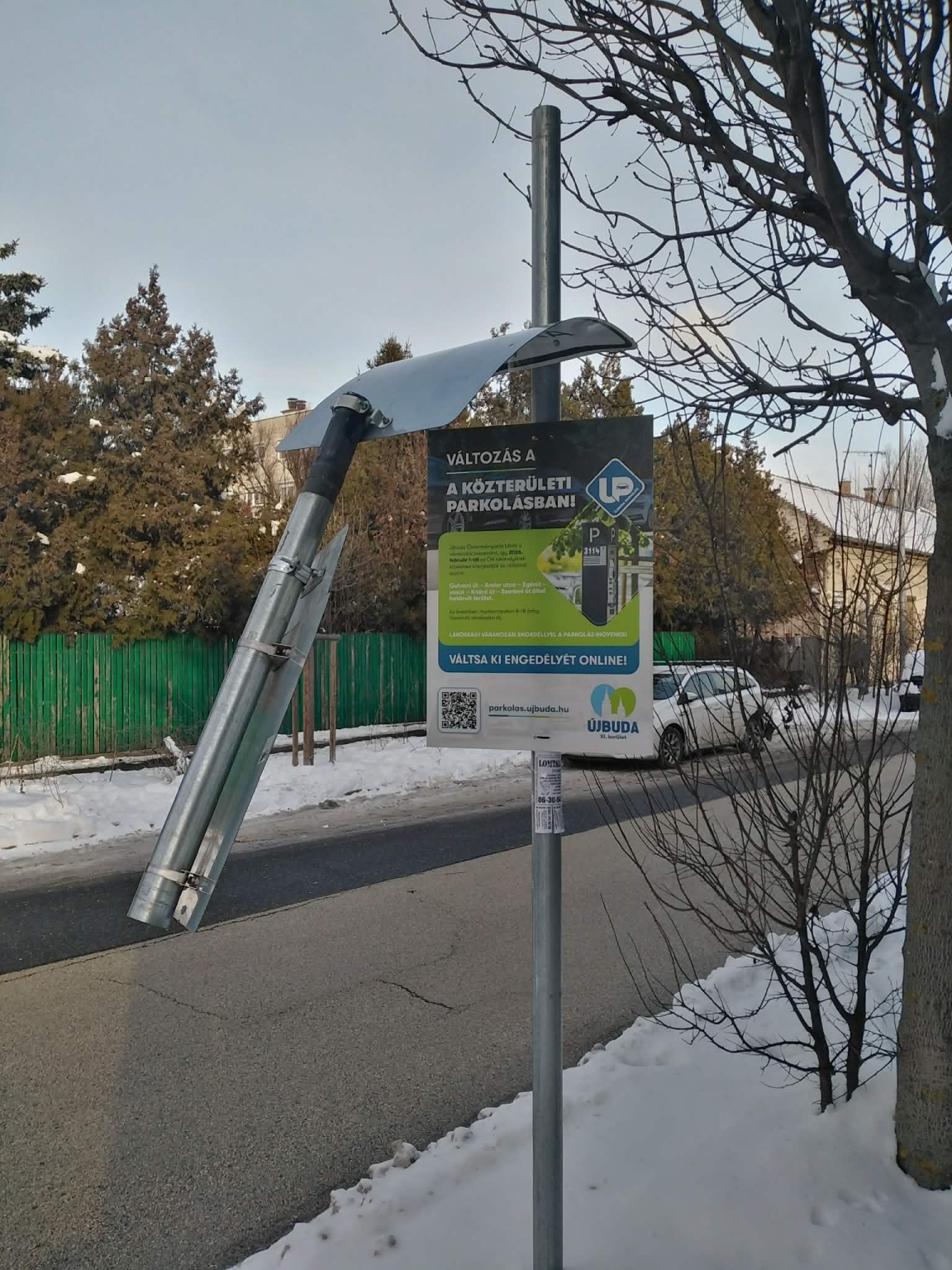 A Budapest XI. kerület Csurgói út / Tétényi út sarkán levő tábla tartórúdja (nem tudom mi a hivatalos neve) látszólag szétcsúszott és emiatt a tábla lehajlott, következő havazásnál le fog törni biztosan. Kérlek titeket, hogy szóljatok a közútnak, hogy ha megy arra autójuk, akkor csusszantsák már vissza a felső csövet a póznába.
