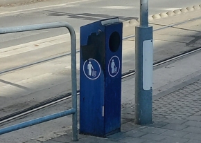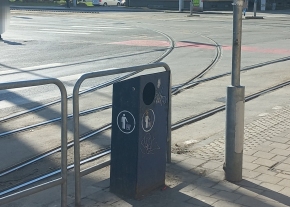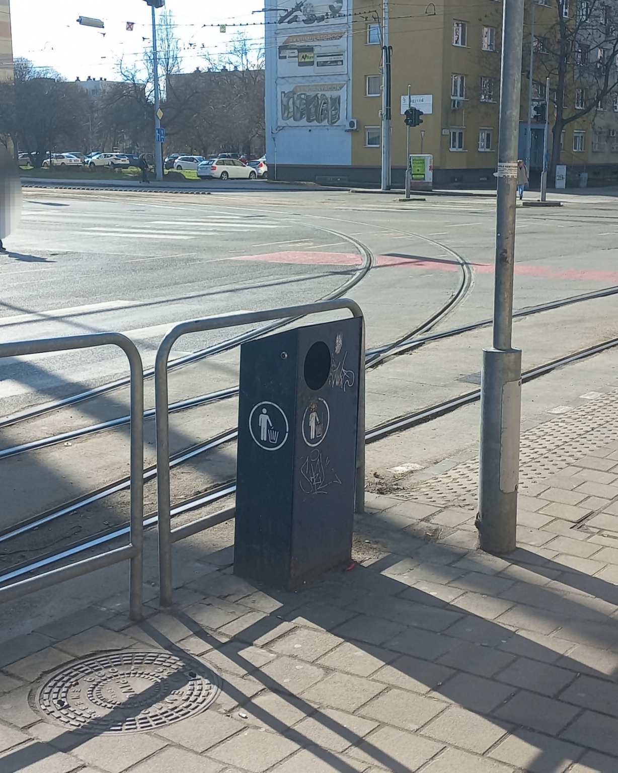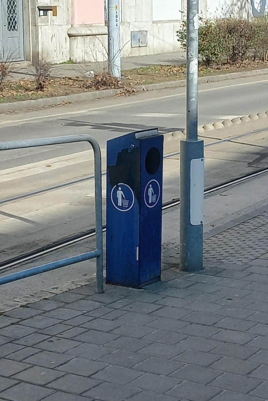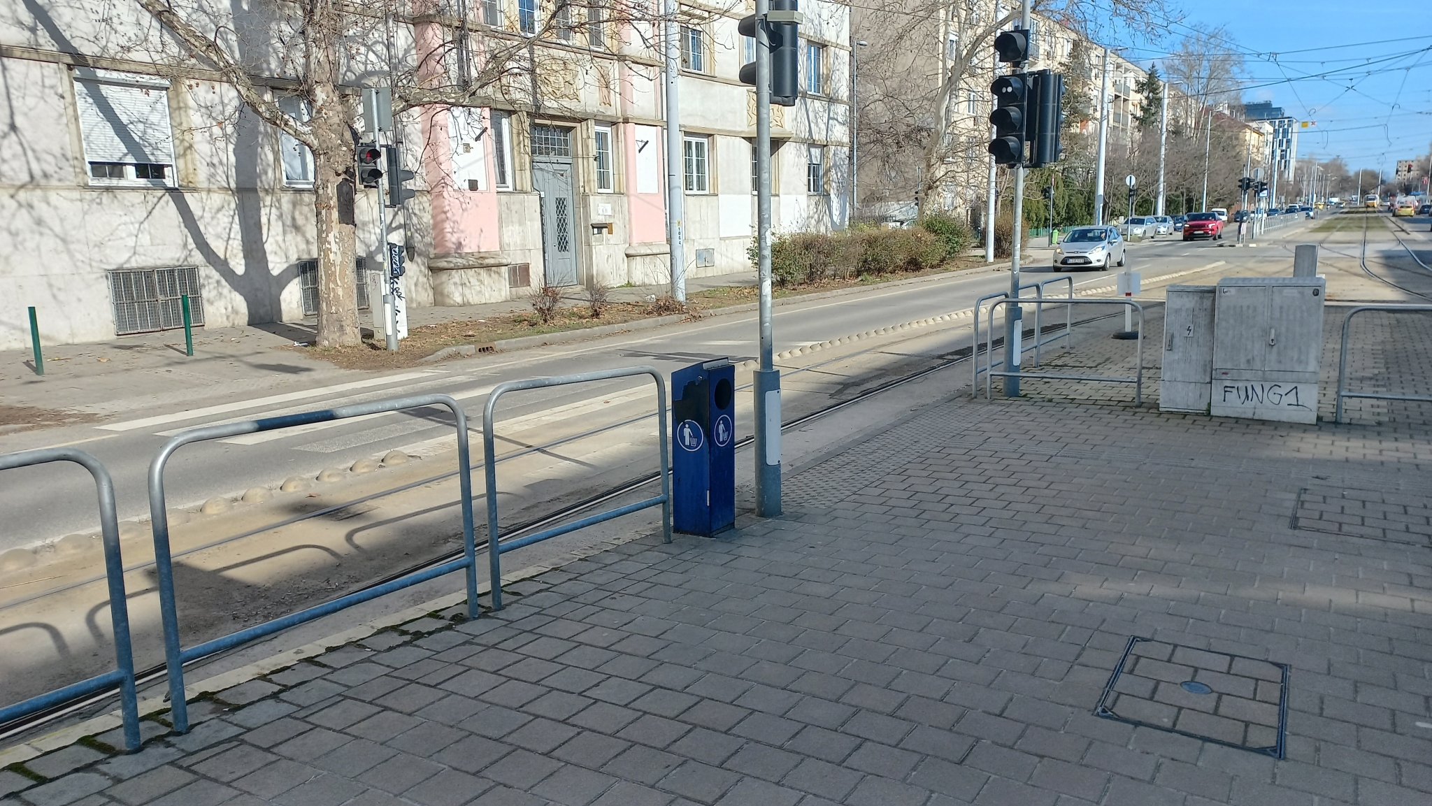 Szemétgyűjtők kritikus állapota villamosmegállóban