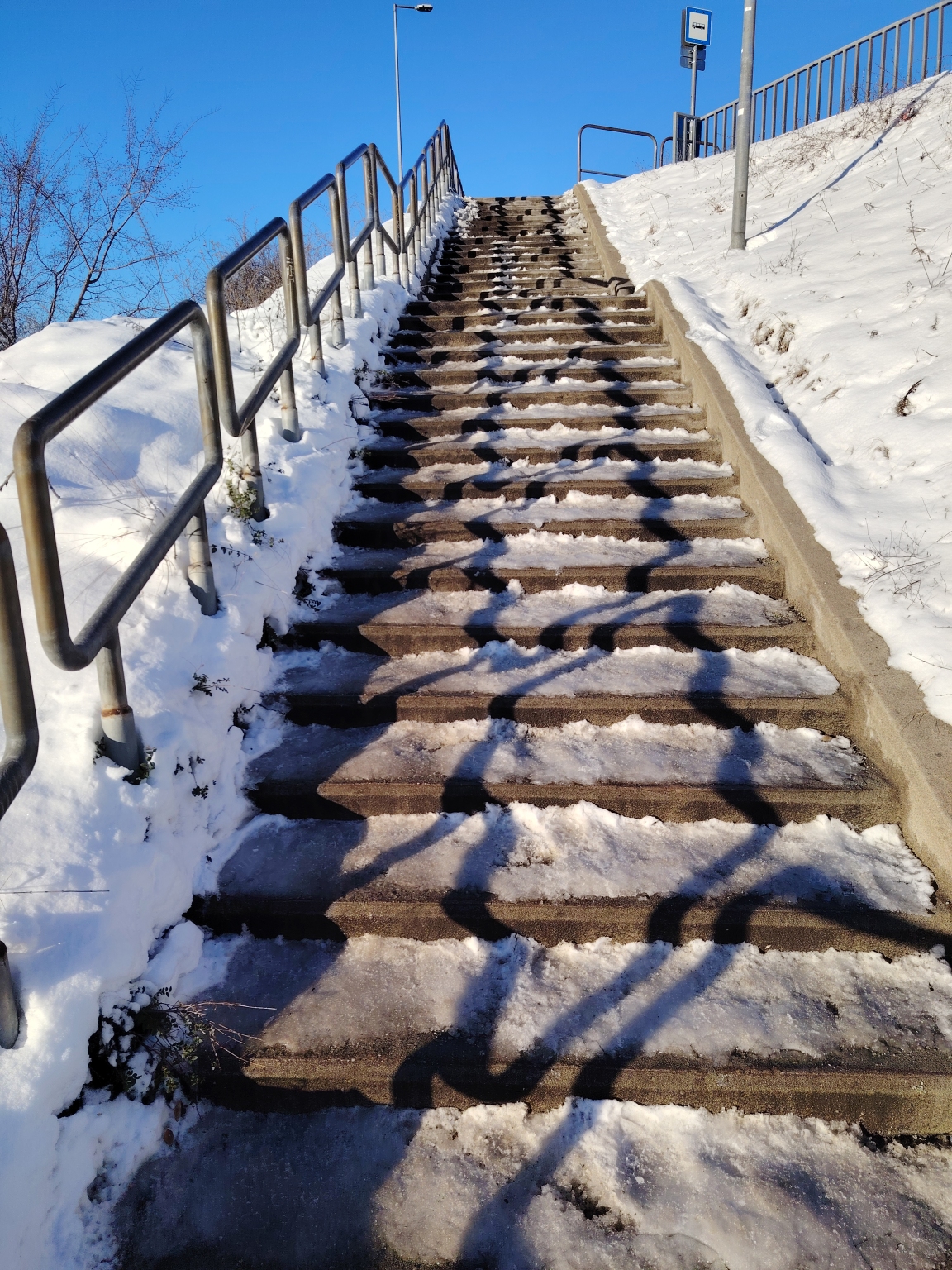 Üdv! A Nagykőrösi út feletti, Szentlőrinci úti felüljáró buszmegállójához vezető lépcső havas-jeges.