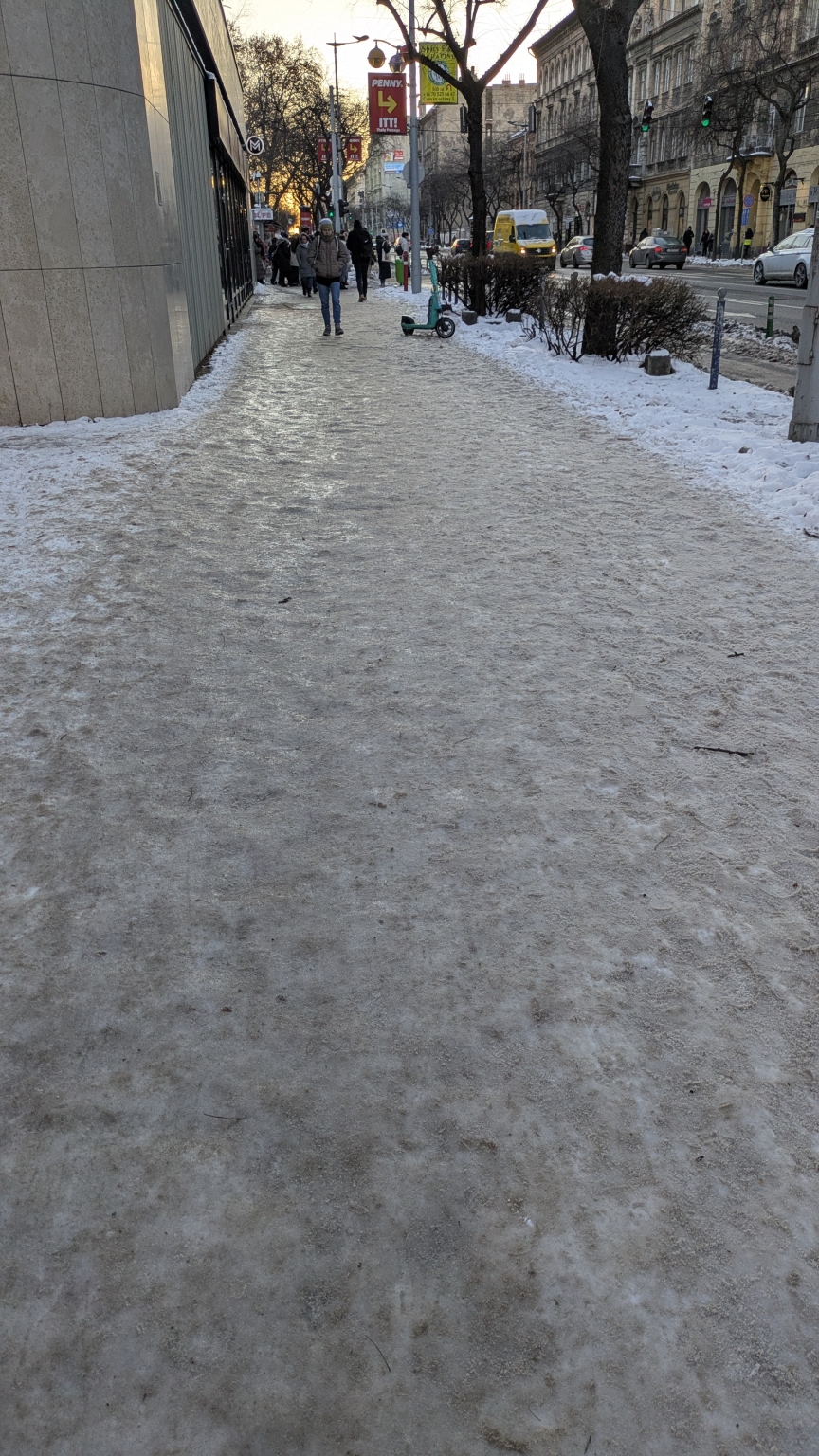 A Bókay utcától a Semmelweis metrómegálló bejáratáig a járdán a letaposott hó nincsen eltakarítva ezért csúszós, balesetveszélyes. Ez a rész mindig problémás havas időben, rendszeresen megfeledkeznek a tisztításáról, pedig a gyerek kórház és az óvoda is innen közelíthető meg.