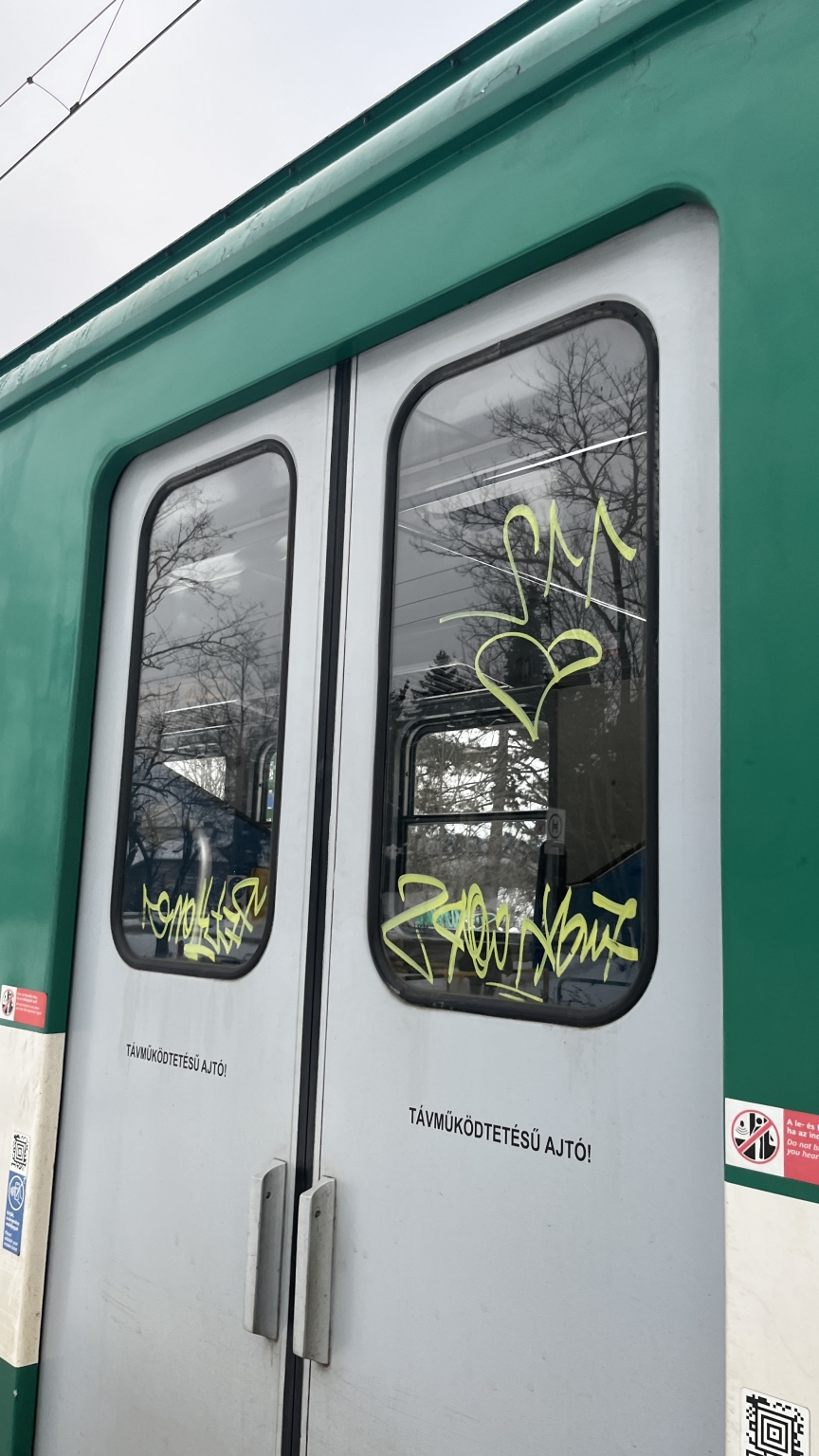 A 901-es HÉV-kocsi egyik ajtaját összegraffitizték.