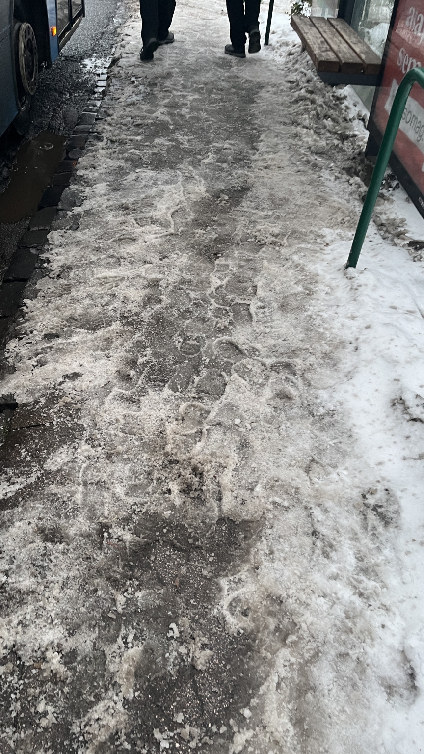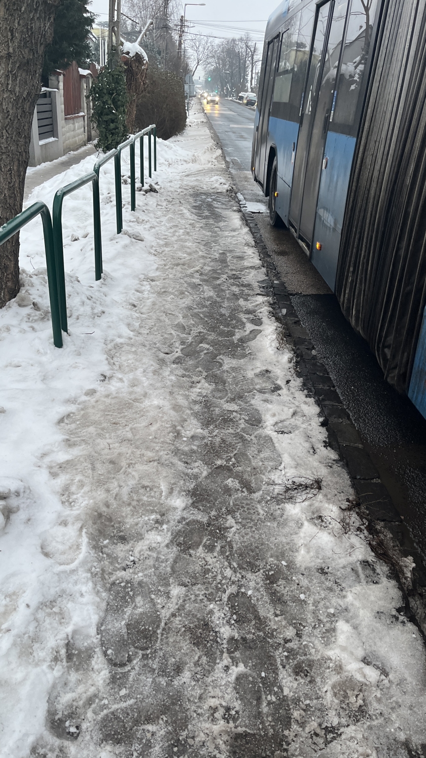 Sashalom H-nál a 45-ös busz Örs vezér tere irányú megállója nagyon keskeny, ráadásul jeges, csúszós is, ami balesetveszélyes. Kérem a jégmentesítését. Köszönöm!