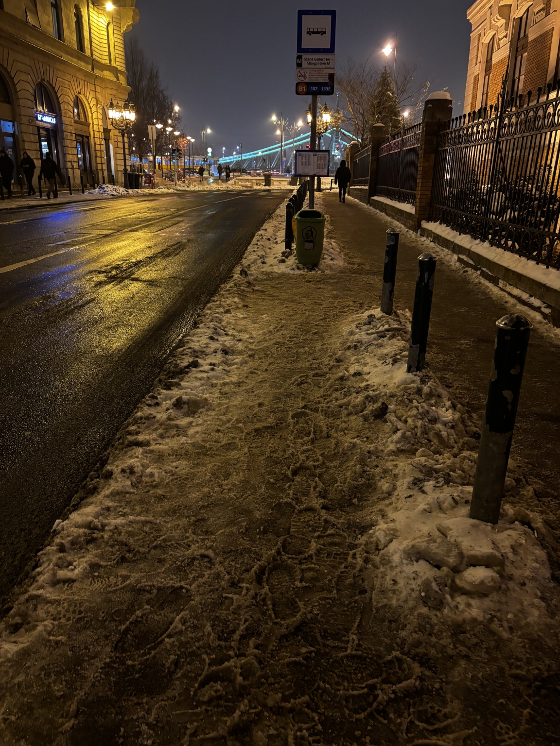 Havazás után több mint egy héttel sincs eltakarítva a hó a 133E busz megállójából a Gellért téren
