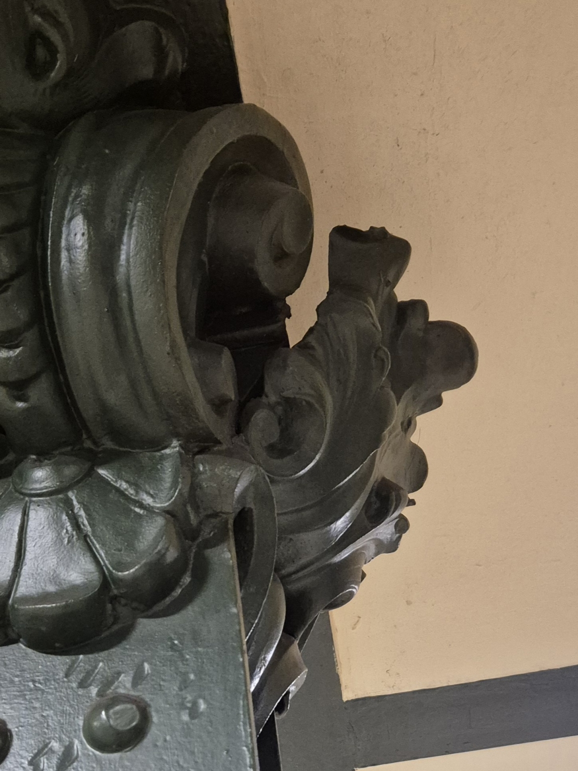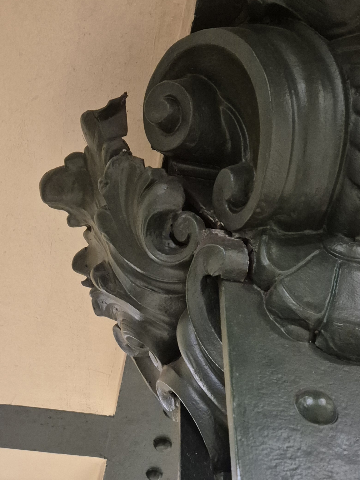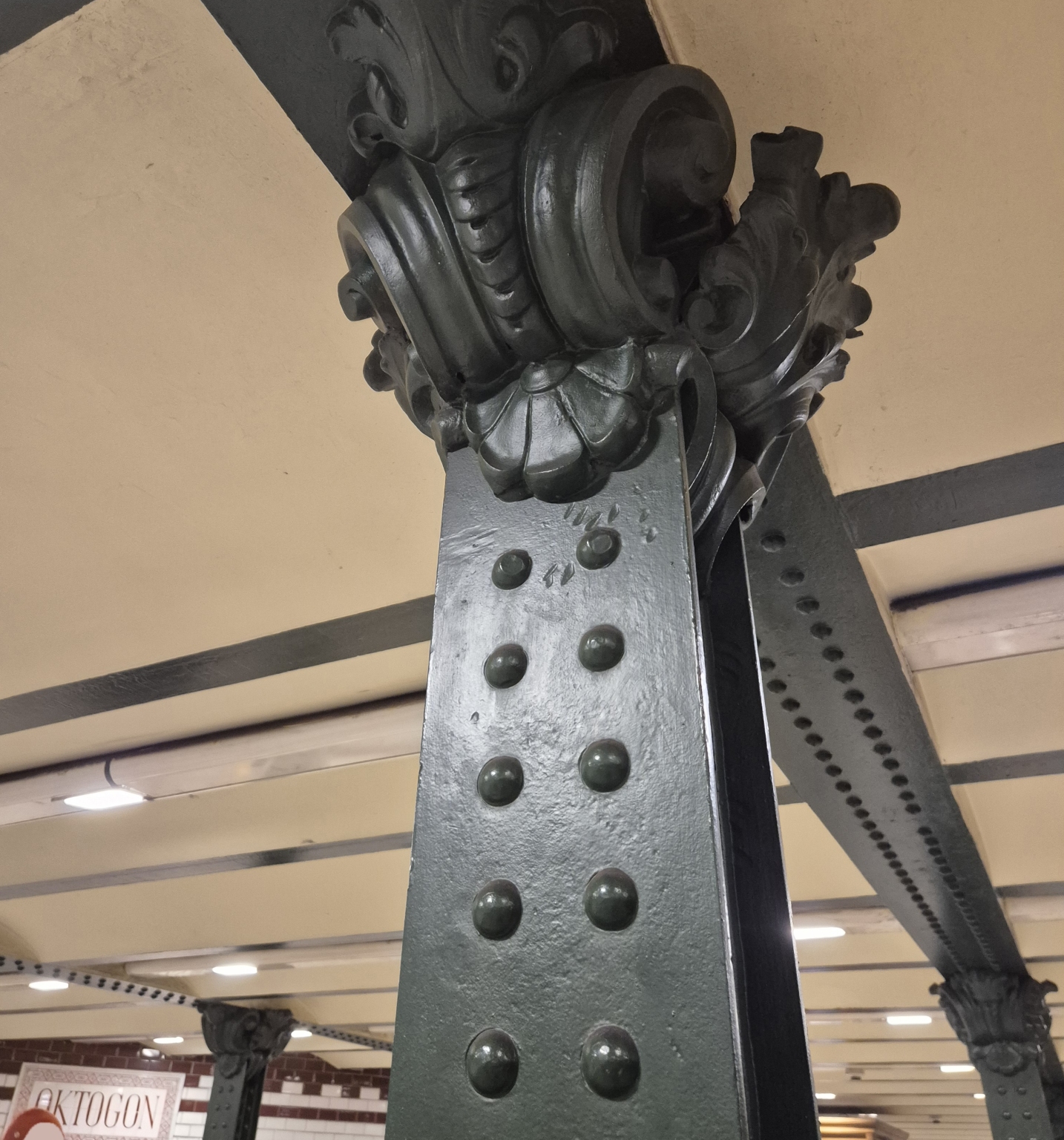 A mexikói út irányába tartó kisföldalatti oktogon megállójában az egyik oszlop dísze el van törve, úgy néz ki, mint ami le akar esni onnan.