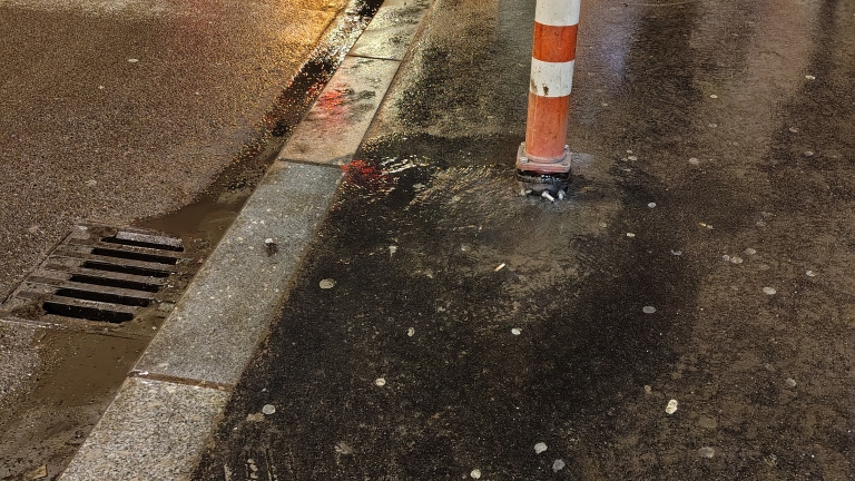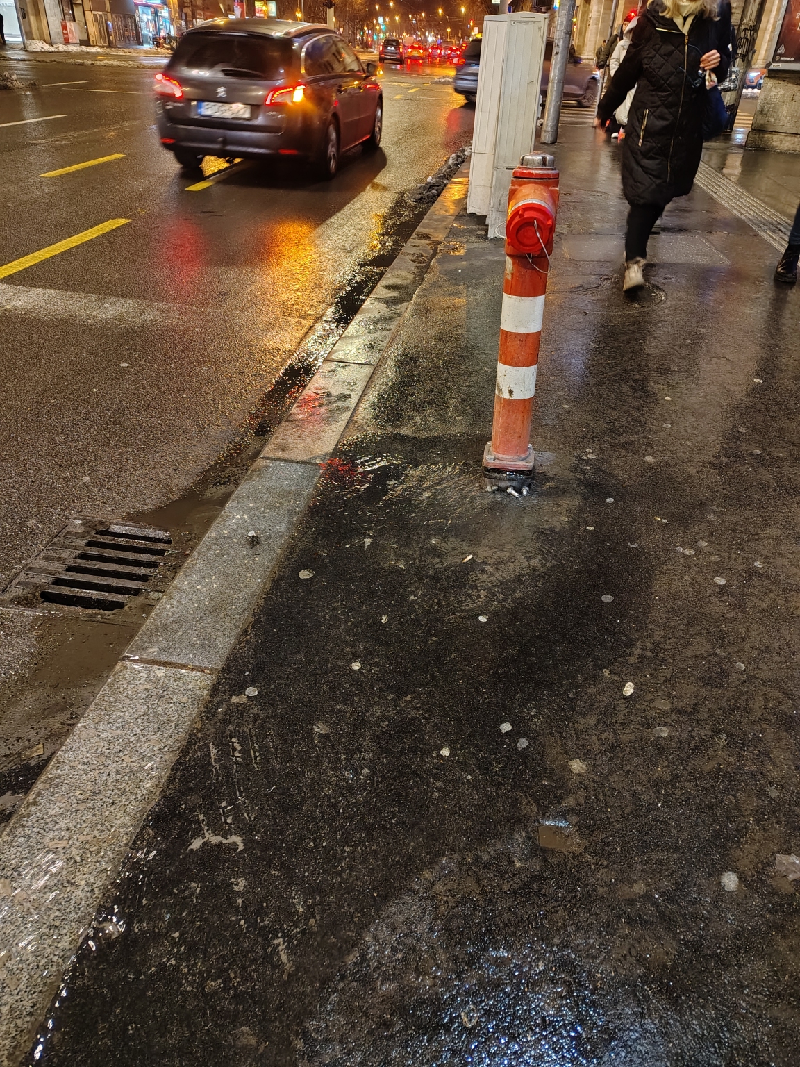 A Blahanal a Rákóczi út és a körút kereszteződésénél a Benu patika elött lévő tűzcsapból alulról folyik a víz.