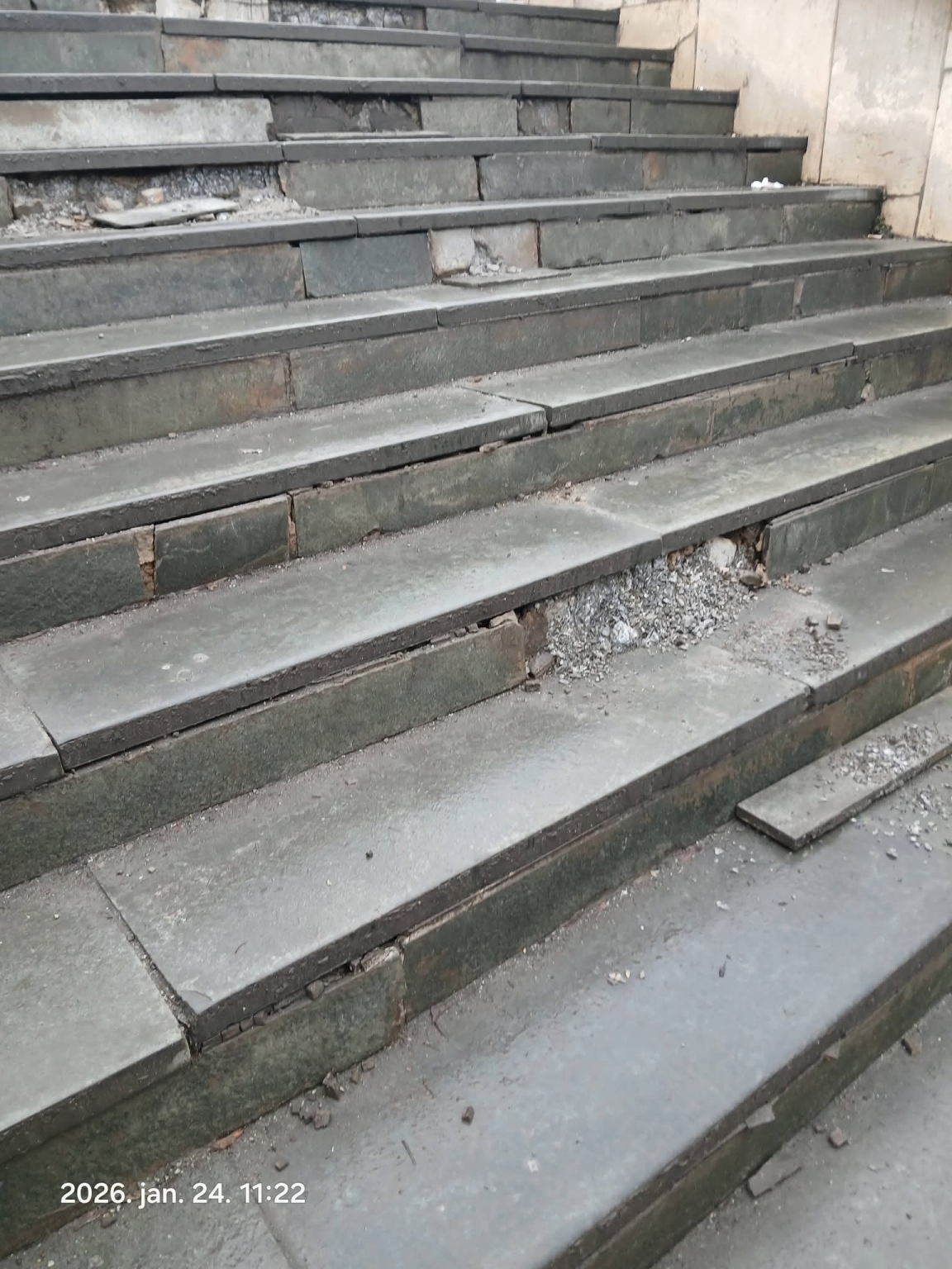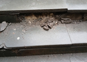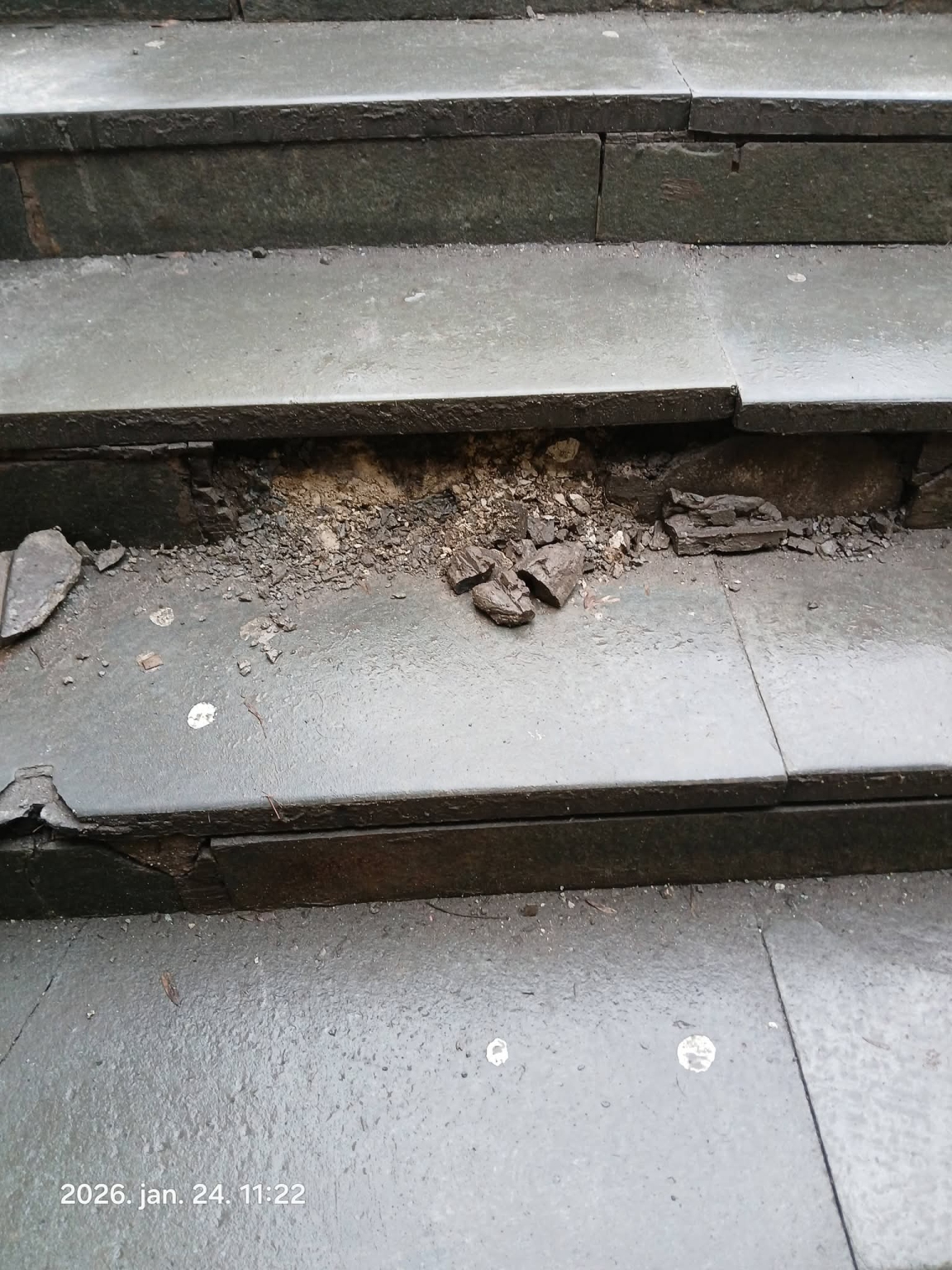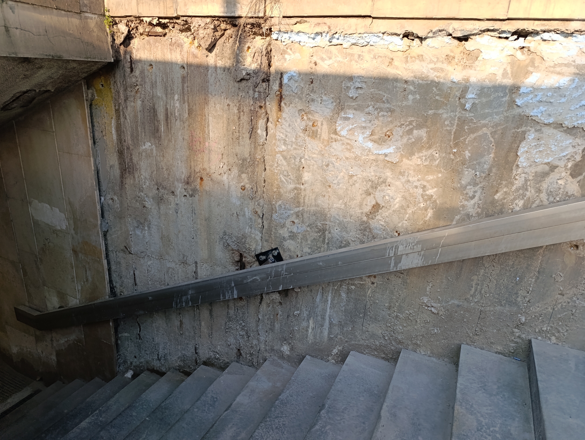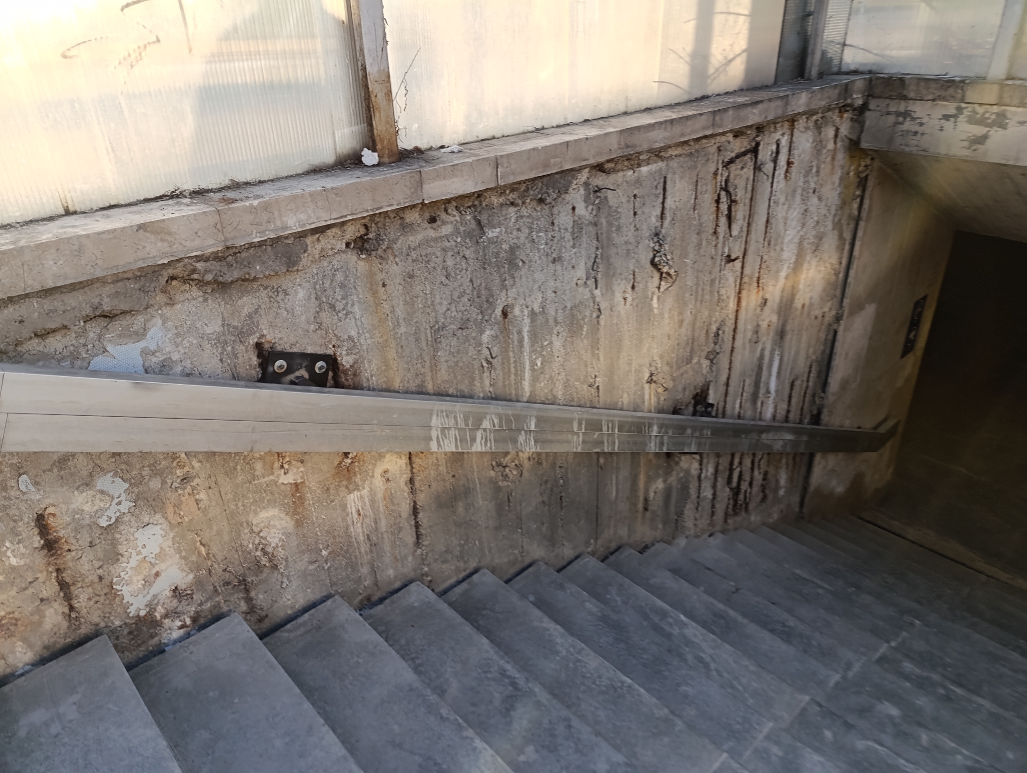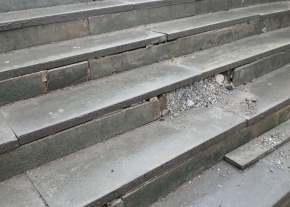A békásmegyeri aluljáróban a Csobánka térre, valamint a Madzsar József utca felé vezető kijáratok lépcsői több helyen töredezettek, a törmelék is kiomlott