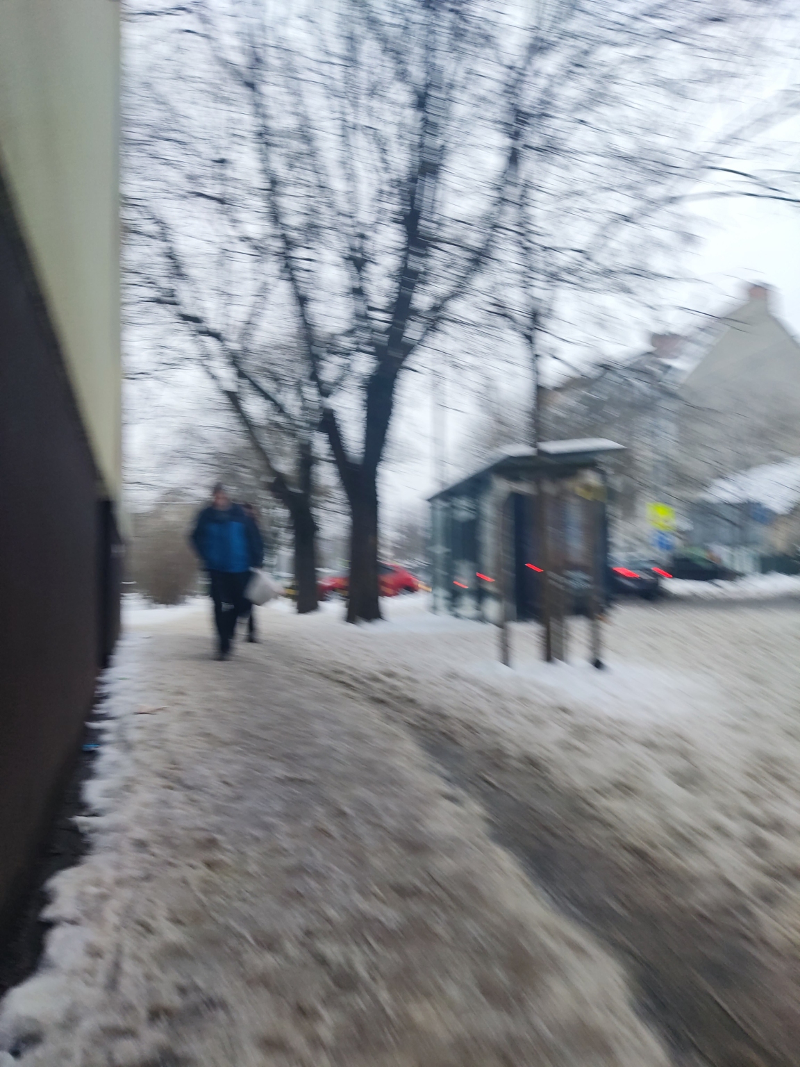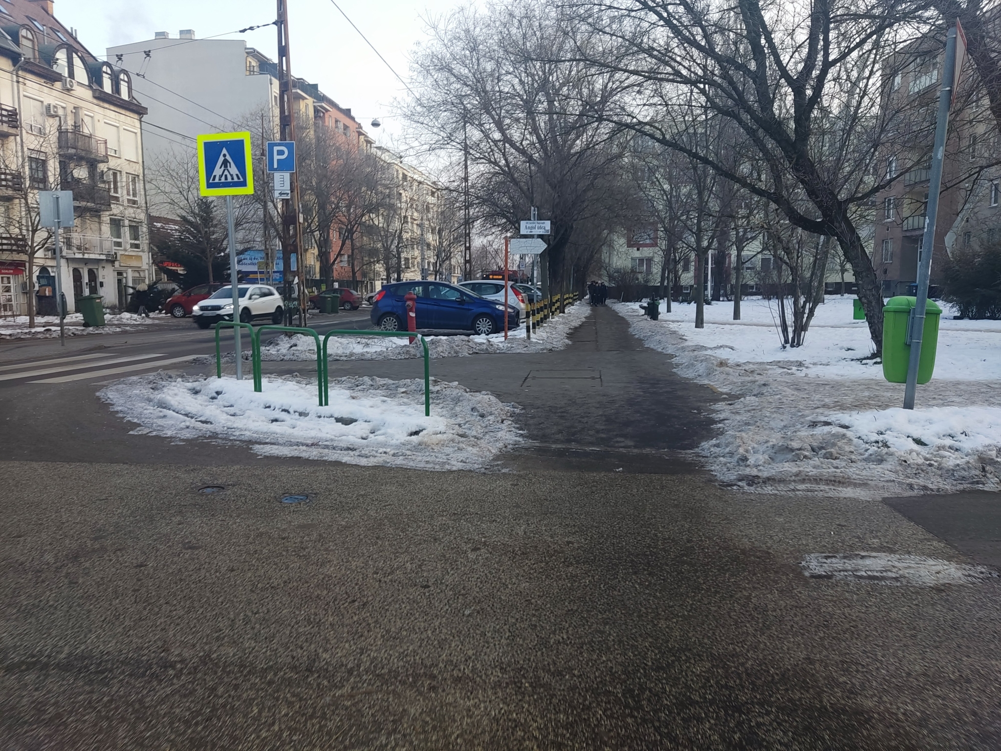 Jeges, havas járda az iskola közelében a jelölt helyen.