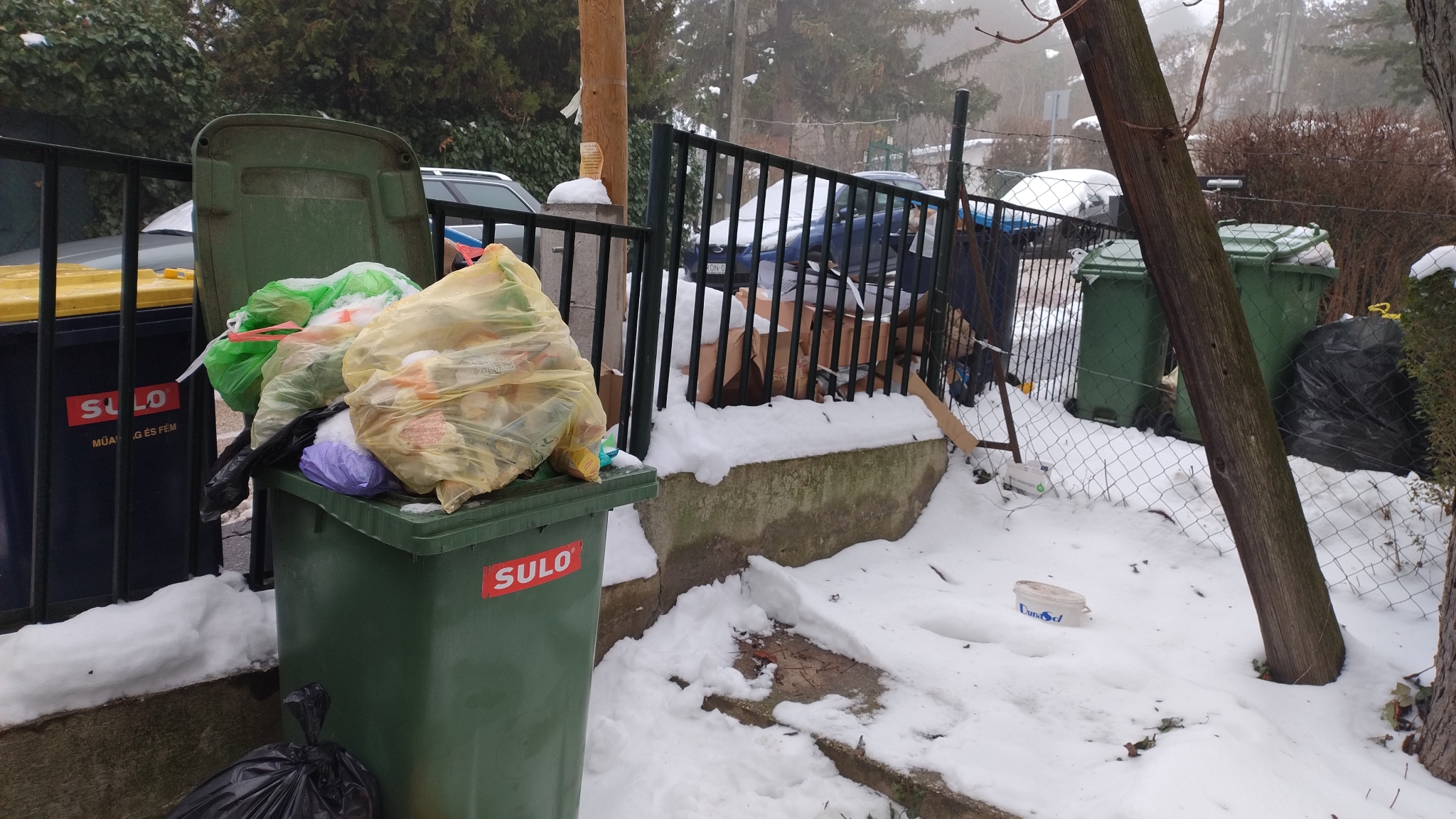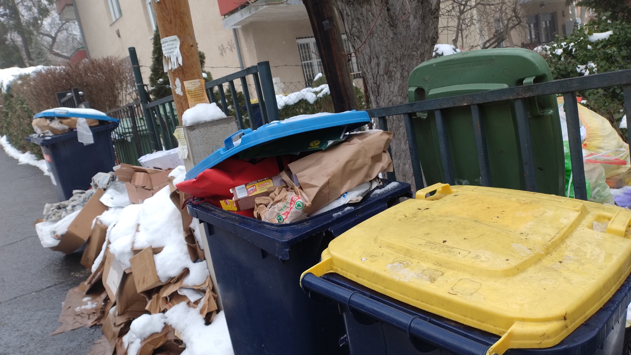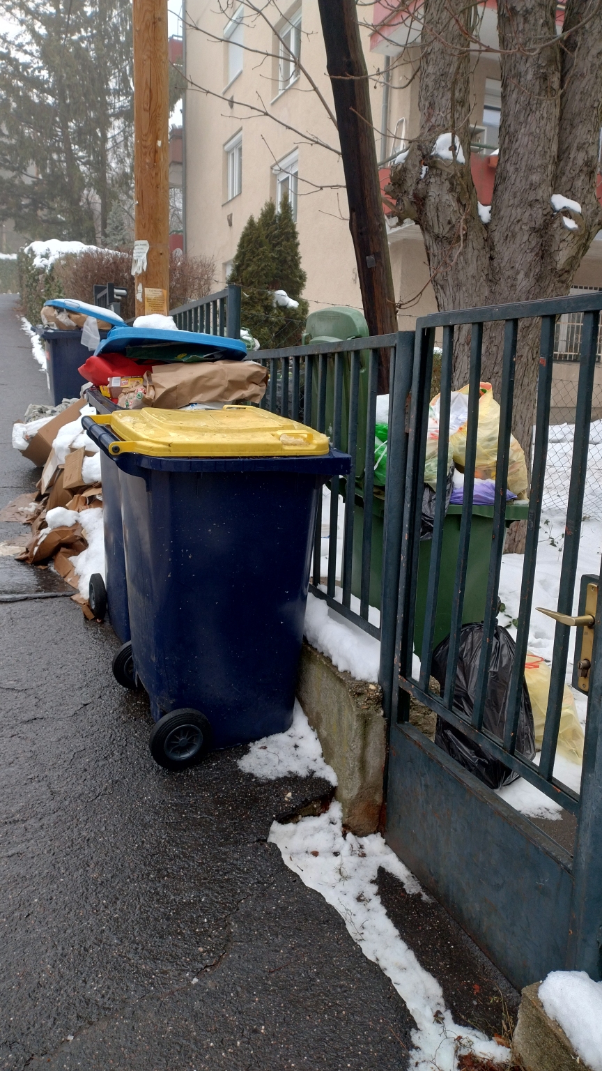 Előző (Január 10.) bejelentésemben a papír hulladék december eleje óta fennálló elszállításának hiányát kifogásoltam. Most már mindennemű hulladék elszállítása megszakadt a XII. kerület Dobsinai utcában. Nem szép a látvány, valamint felmerül a "vajon miért is fizetek?" kérdés is.