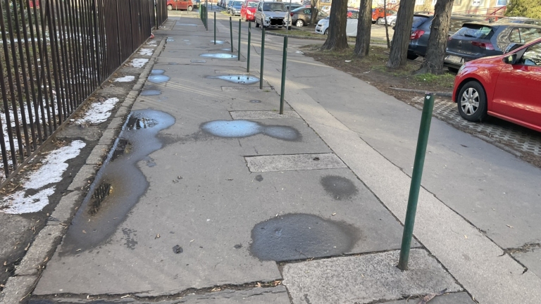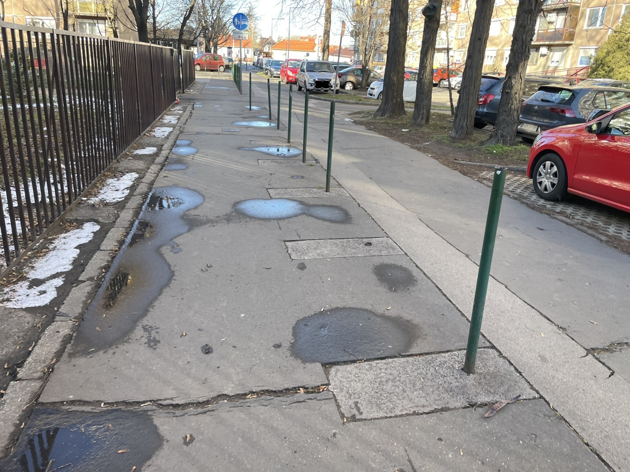 Hiányzik a poller az iskola előtt így a kocsik be tudnak hajtani a gyalogosoknak fenntartott, védett járdára