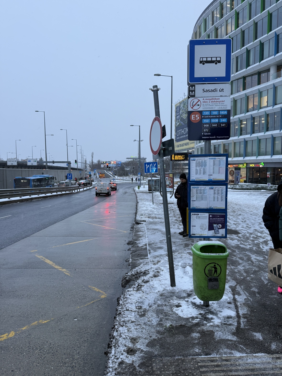 A Sasadi úti (BAH-csomópont irány), hátrébb lévő buszmegállóban van ez a ferde oszlop, amin lóg a behajtani tilos tábla. Ezt a táblát lassan csak a Szentlélek tartja, szélben csapkod össze-vissza. Félő, hogy elszabadul és eltalál valakit vagy nekiszáll az egyik busznak. Az oszlopon található még pár kiegészítő KRESZ tábla is. Legyenek szívesek az oszlopot kiegyenesíteni, ha kell, beljebb rakni. A rajta lévő táblákat megfelelő irányba állítani, azokat rögzíteni.