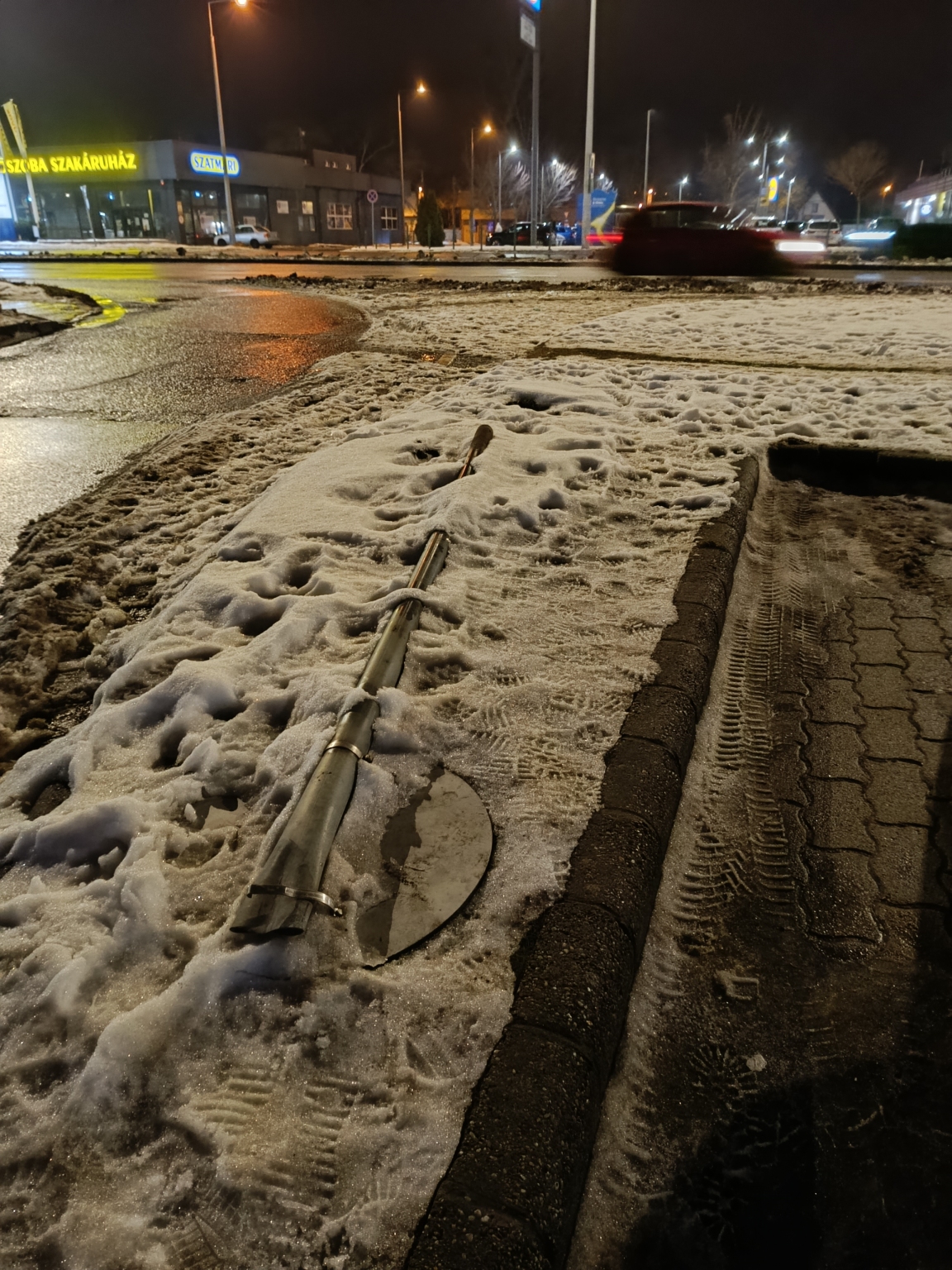 Csillaghegy Csillag Center parkoló bejáratánál kidőlt egy közlekedési tábla.