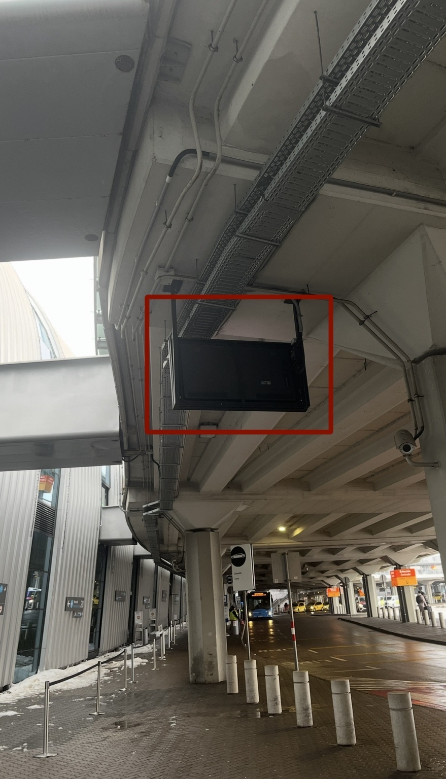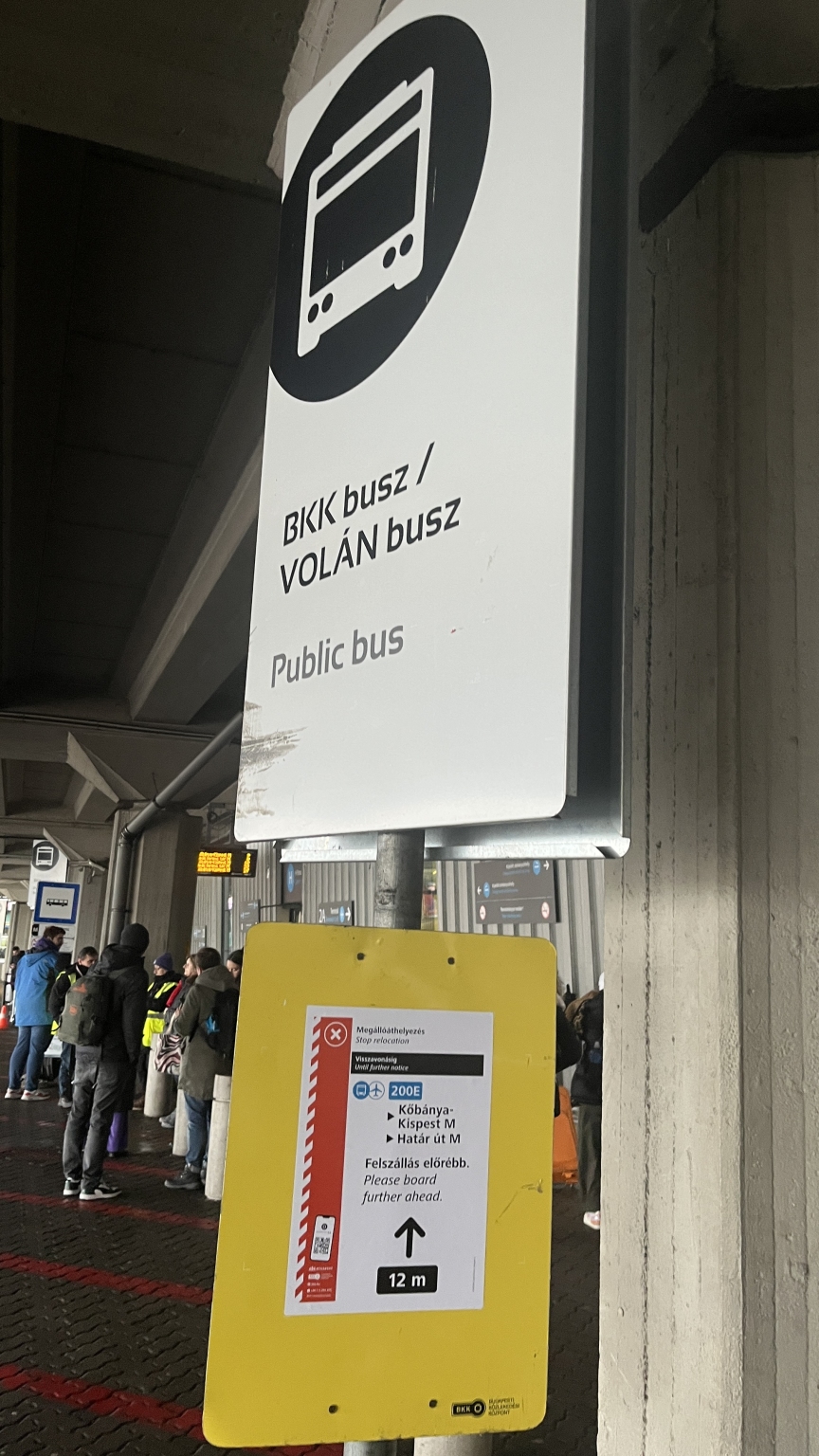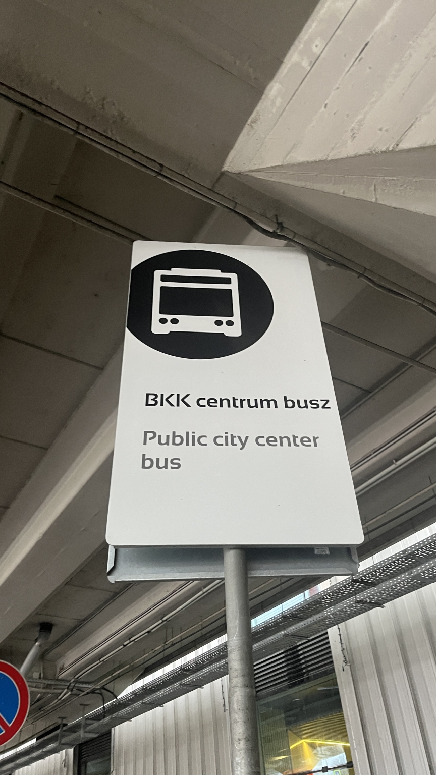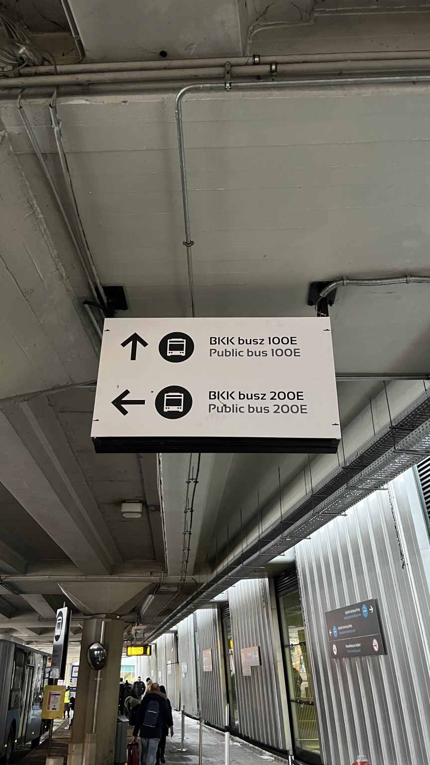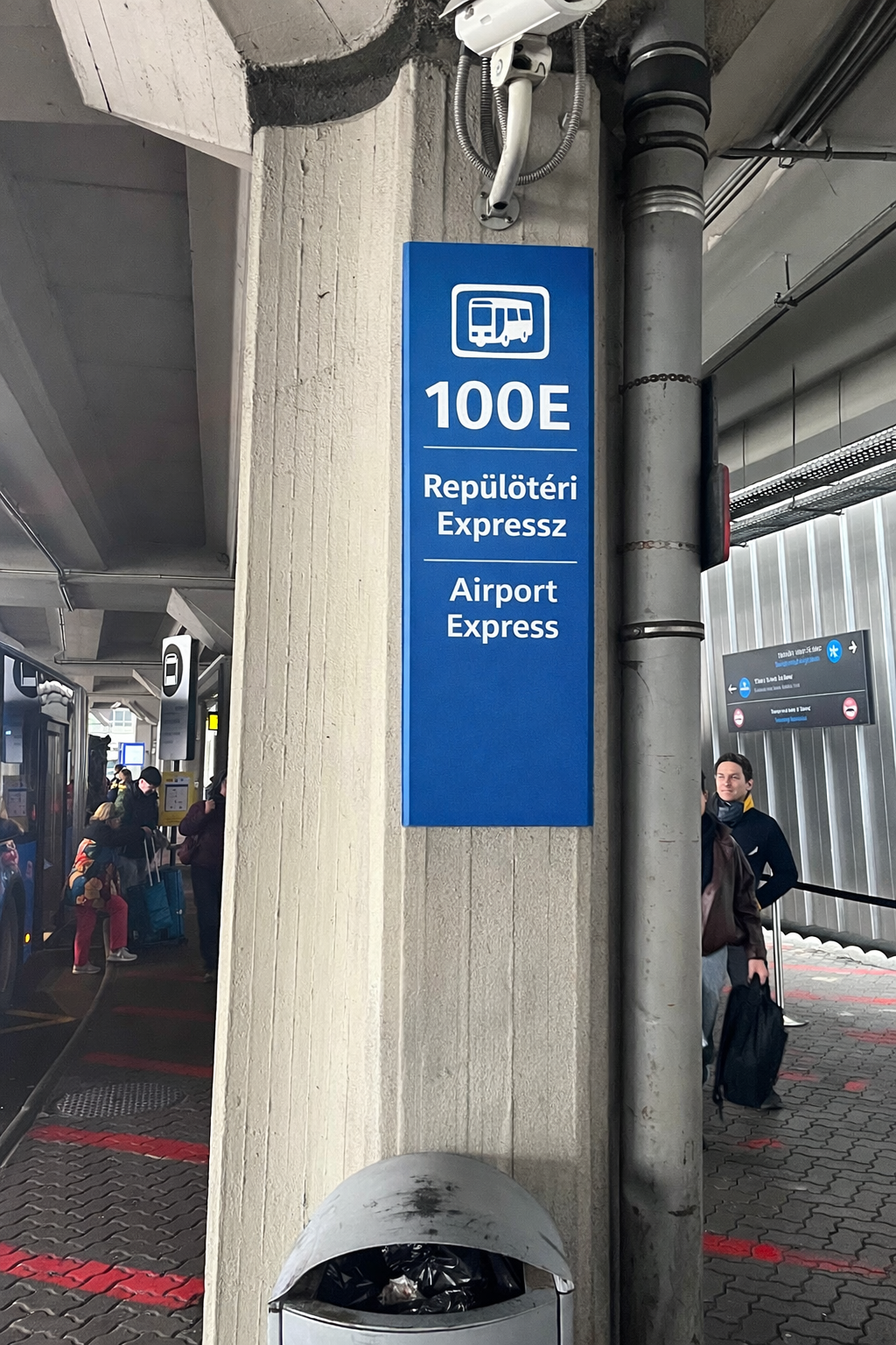 A 200E autóbusz megálló végénél, a digitális kijelző hátulján elhelyezett tábla szövege meglehetősen semmitmondó. Ezt a hibát az épületben, a kijáratok felett már javították. Javaslom, hogy a BKK hivatalos elnevezéseit használják: 100E Repülőtéri Expressz / 100E Airport Express; 200E autóbusz / Public bus 200E. A 100E-t már csak azért sem érdemes “public bus” jelzővel illetni, mert az külön díjszabással vehető igénybe. Egy ilyen táblát a 2B oldalon, az automaták környékén felfüggesztett kijelző hátuljára is elhelyezhetnének.