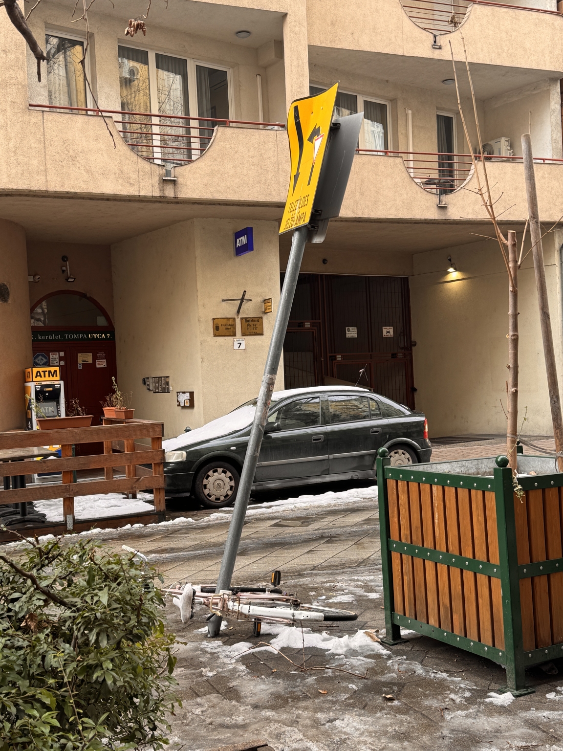 A közlekedési tábla kidőlt és meg van rongálódva, illetve régen otthagyott kerékpár leszerelése szükséges.