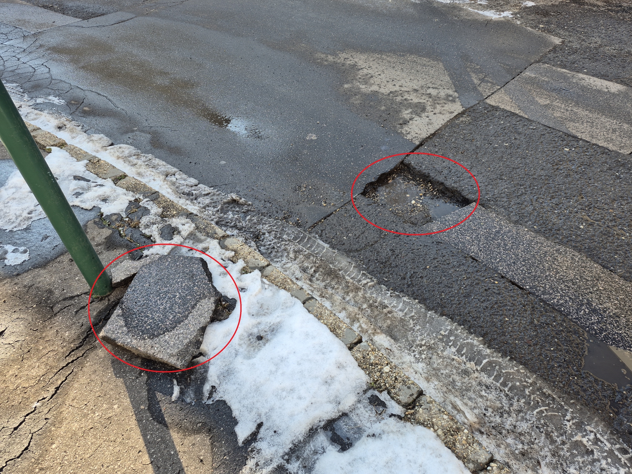 Képek csatolva (2db jelenlegi állapot; 1db áttekintő kép Google Street View-ről, amelyen még nem volt kátyú)