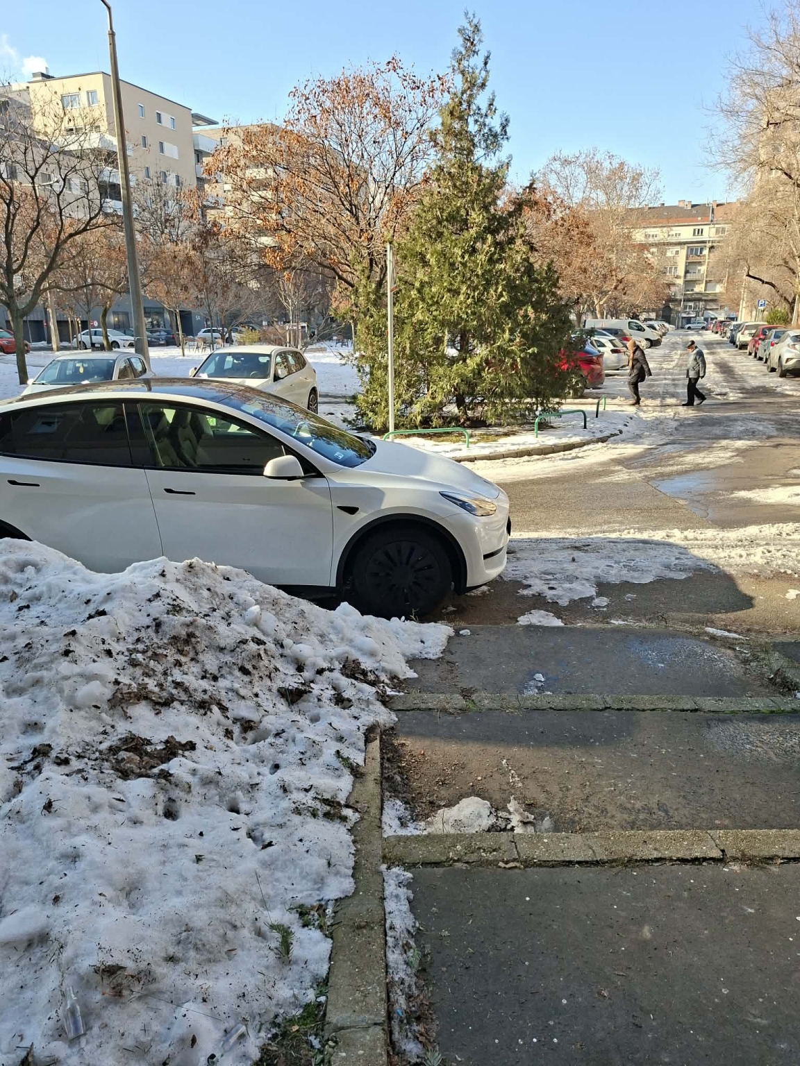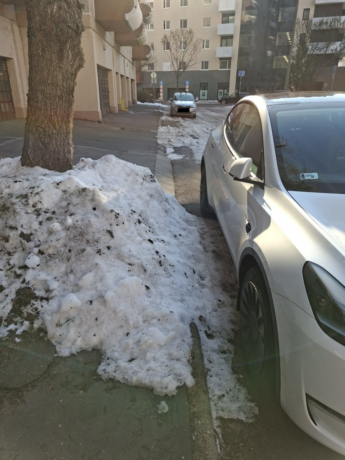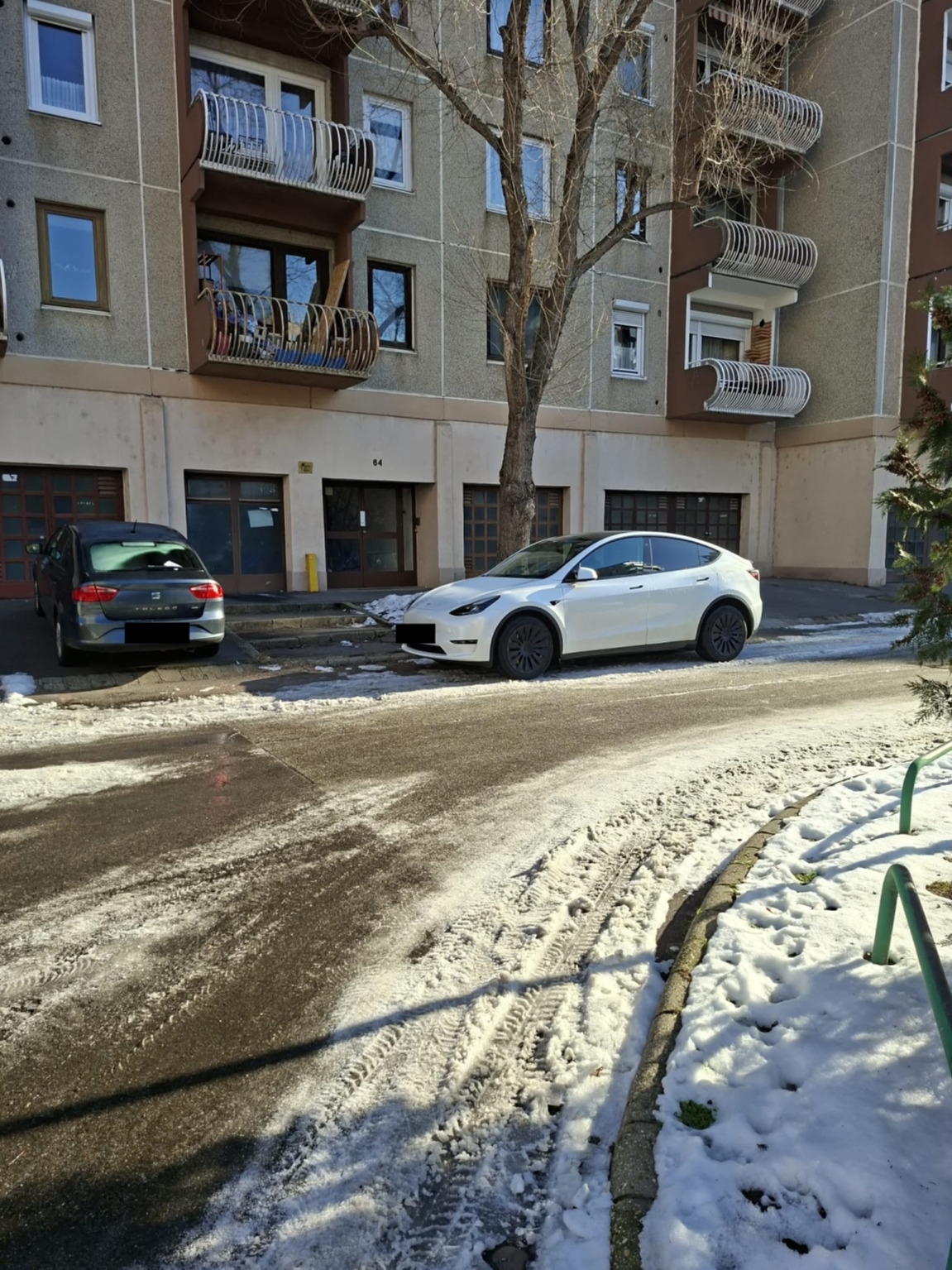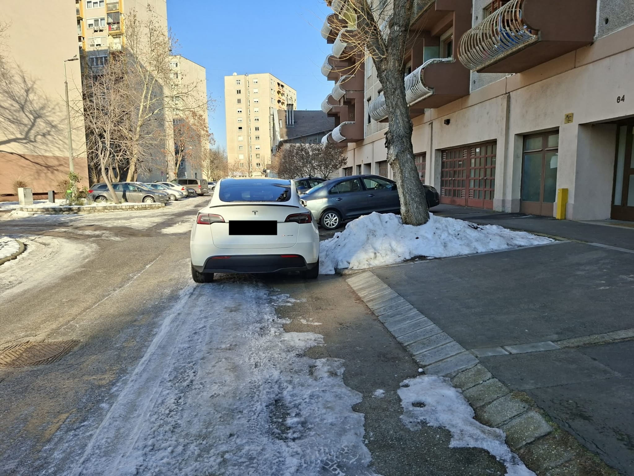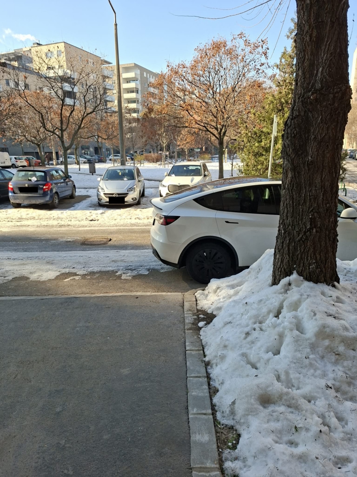 A társasház előtti garázsok között van egy kis rész, ahol egy fa van és lépcső az épület bejárat előtt. A képviselet tisztán elmondta, hogy nem használható parkolónak az önkormányzati irányelv szerint. A környéken rengeted parkoló elérhető a park körül. Mégis mindig ott áll valaki a fa előtt. Több szempontól is problémás. Képen láthatóan az ott parkoló mindig belóg vagy a garázsbejáróba vagy a lépcsőbe vagy mindkettőbe. Mostani havazásban például ott nem tudták eltakarítani a havat. A T elágazásból kikanyarodókat akadályozza az ott parkoló autó. Egy megállni tilos tábla egy 4m kiegészítő táblával megoldaná ezt a problémát.