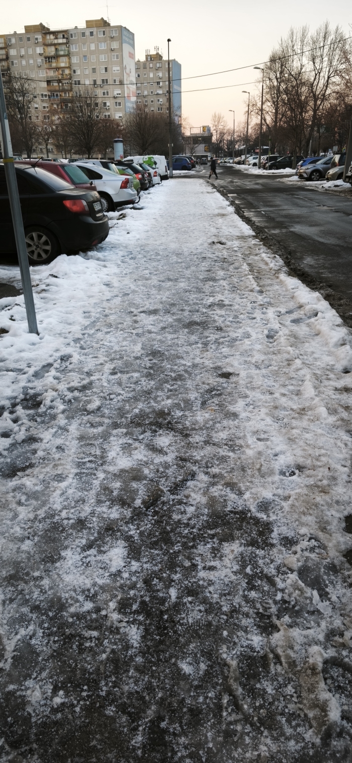 Kispesten a Batthyány és a Petőfi utca közötti kis járda rész, csúszás és baleset veszélyes.