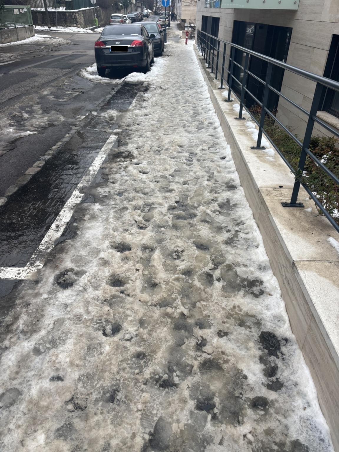 A Sunhill Residence Lisznyai utcai járdáját vastag jégpáncél borítja, ez így balesetveszélyes.