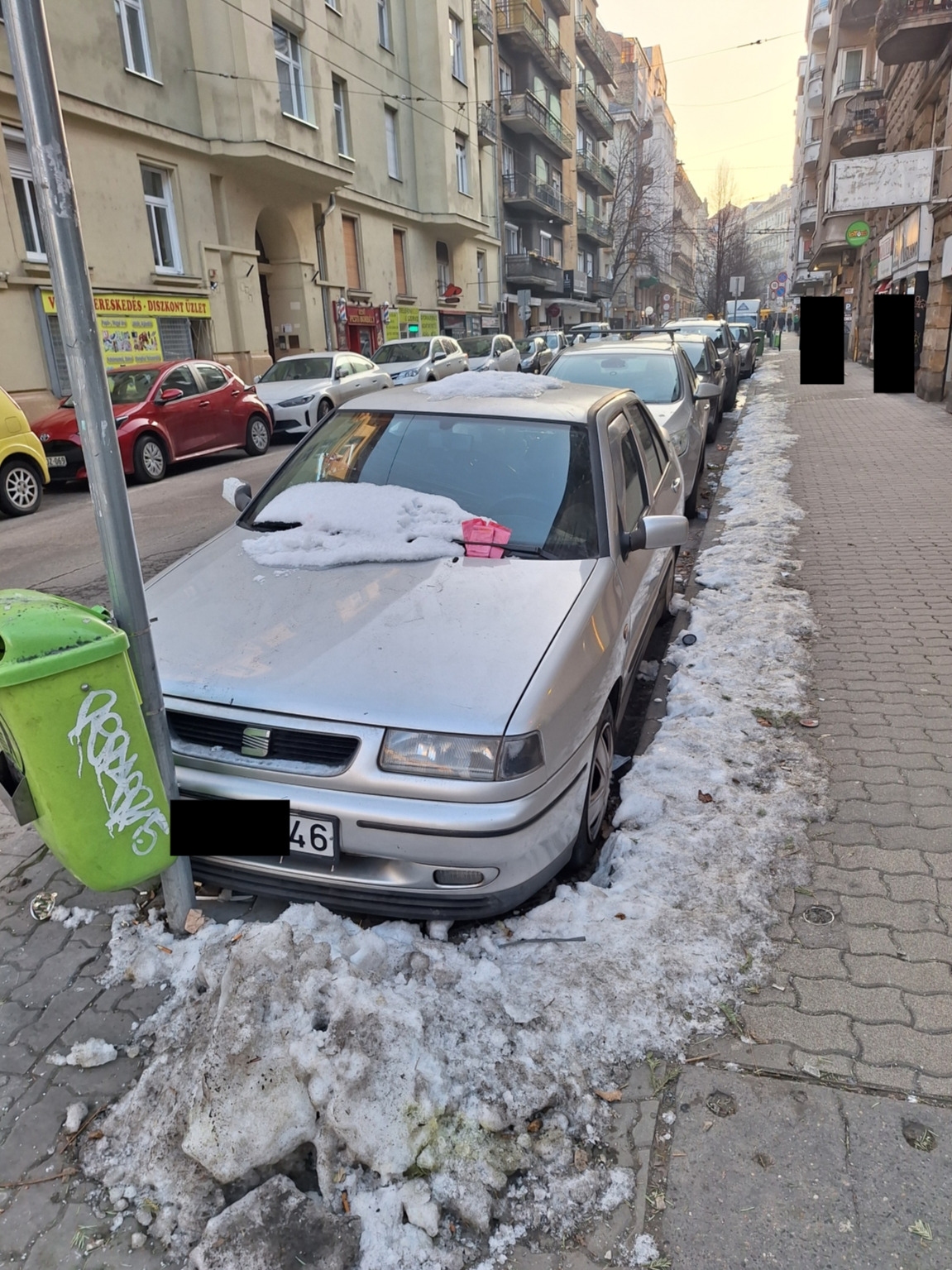 Több hete/hónapja parkol egy autó megpakolva büntetésekkel, az utca sarkon lévő közlekedési táblának nekinyomodva.