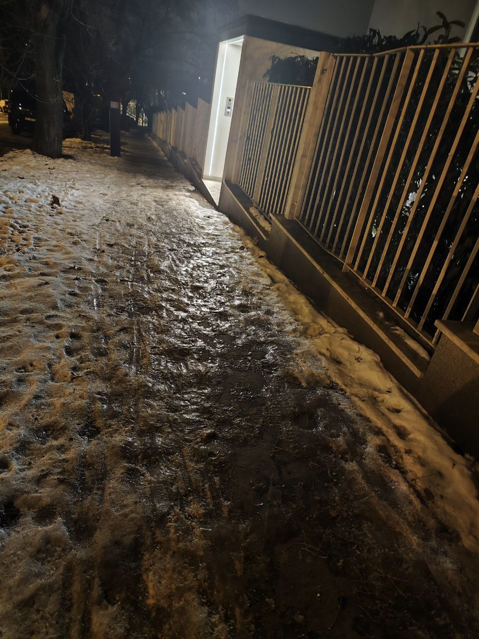 Szilveszteri, januári hó jéggé fagyva a járdán