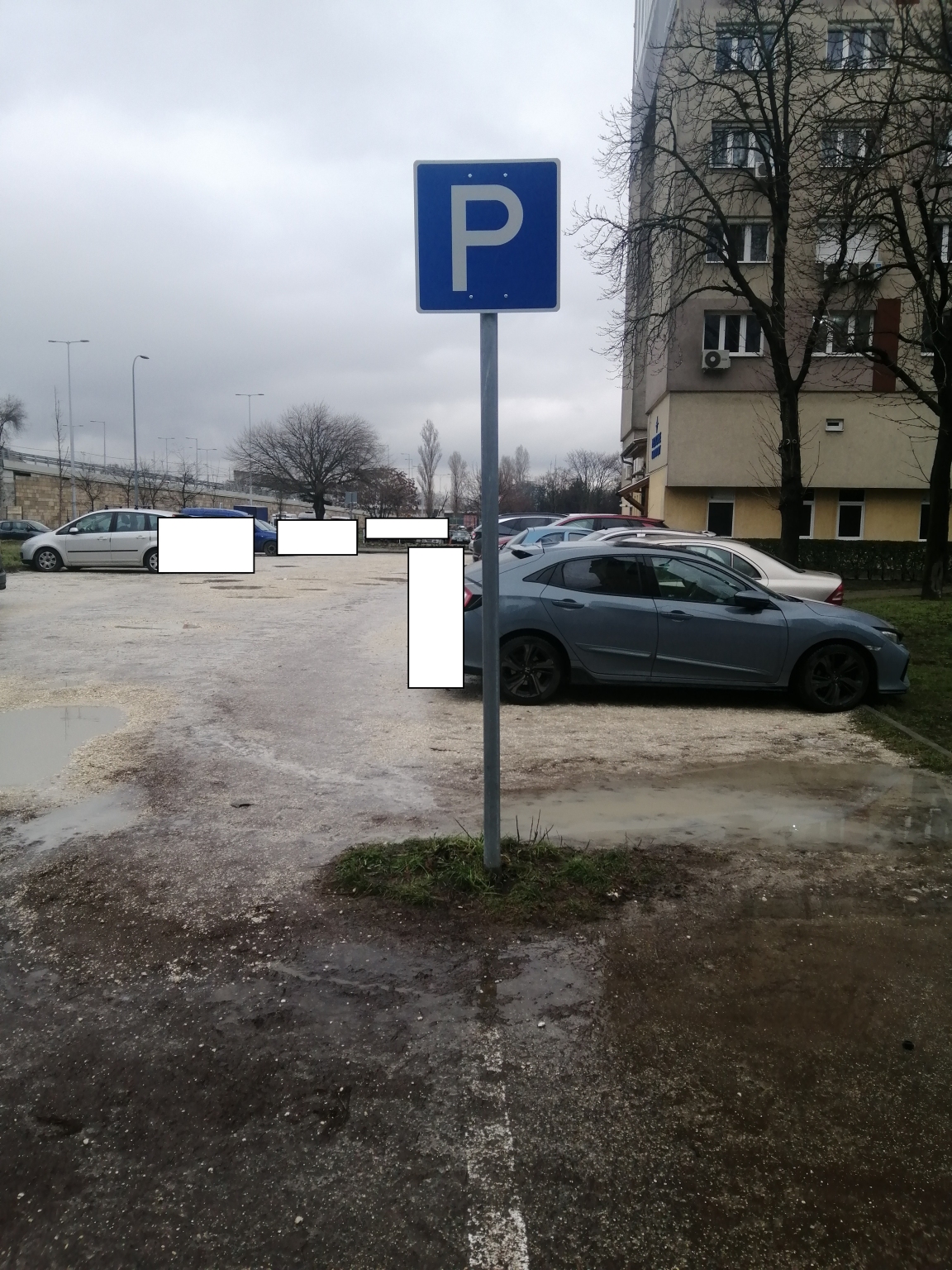 A Budapest III. kerület, Kálvin közben álló "Parkoló" közlekedési táblát kellene függőleges pozícióba hozni.
