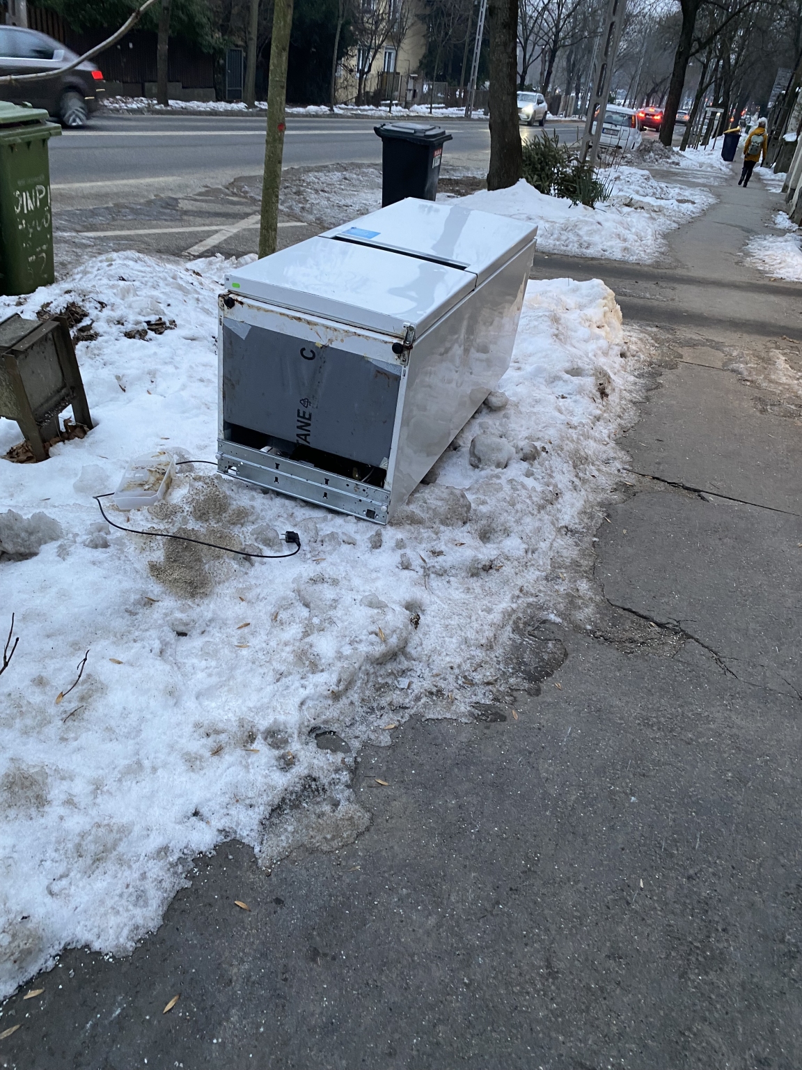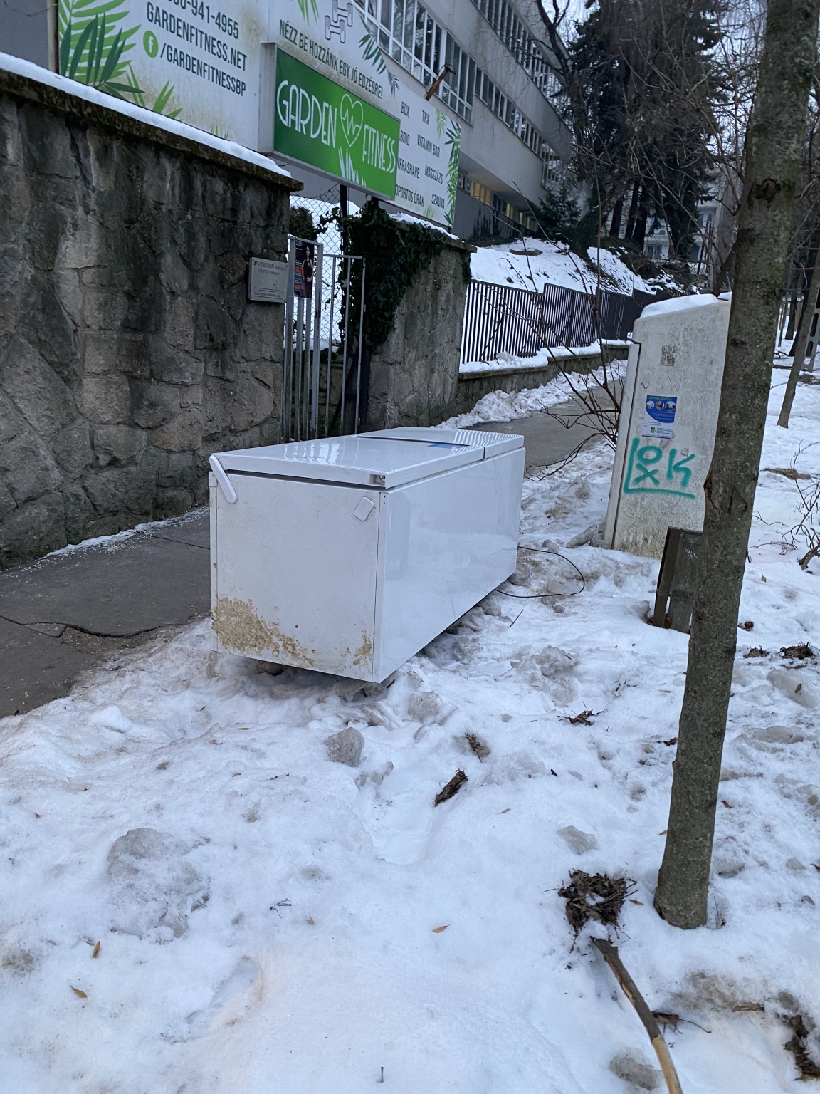 A Hűvösvölgyi út 75. szám alatt egy kidobott hűtőszekrény található. Kérem szíves intézkedésüket az elszállítás érdekében.