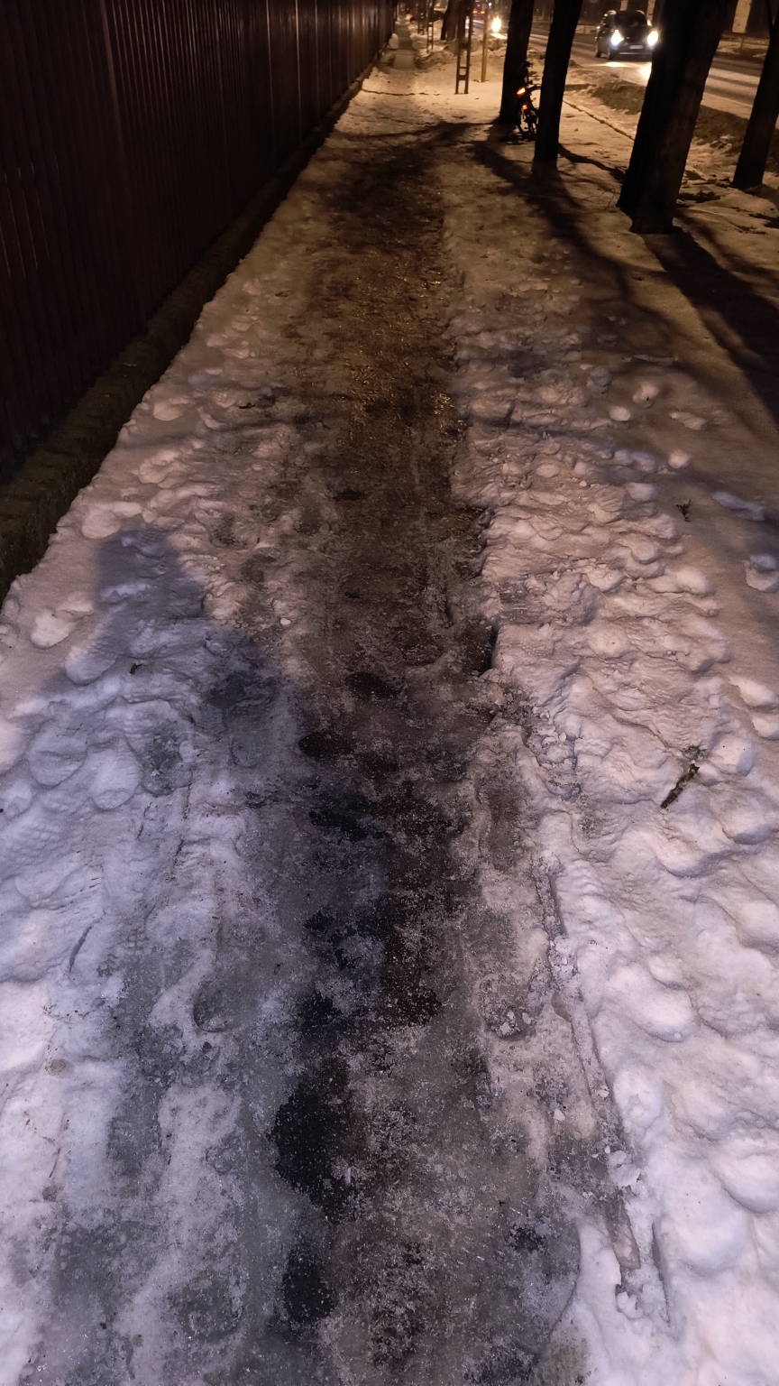 Jardaszakasz vastag, egyenetlen jeggel boritva, az Ujszasz utca Irisz es Csenkesz utca kozotti szakaszan.