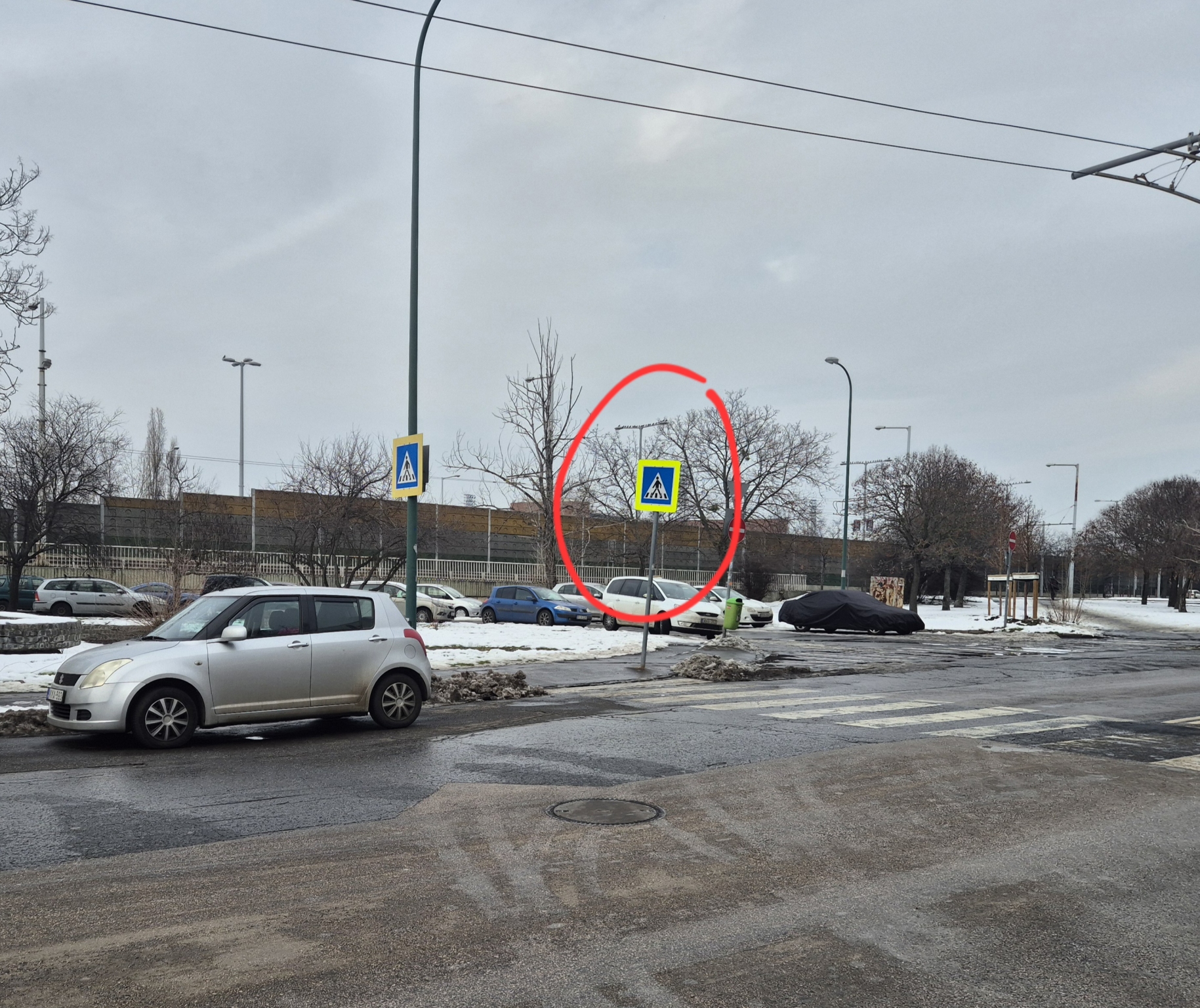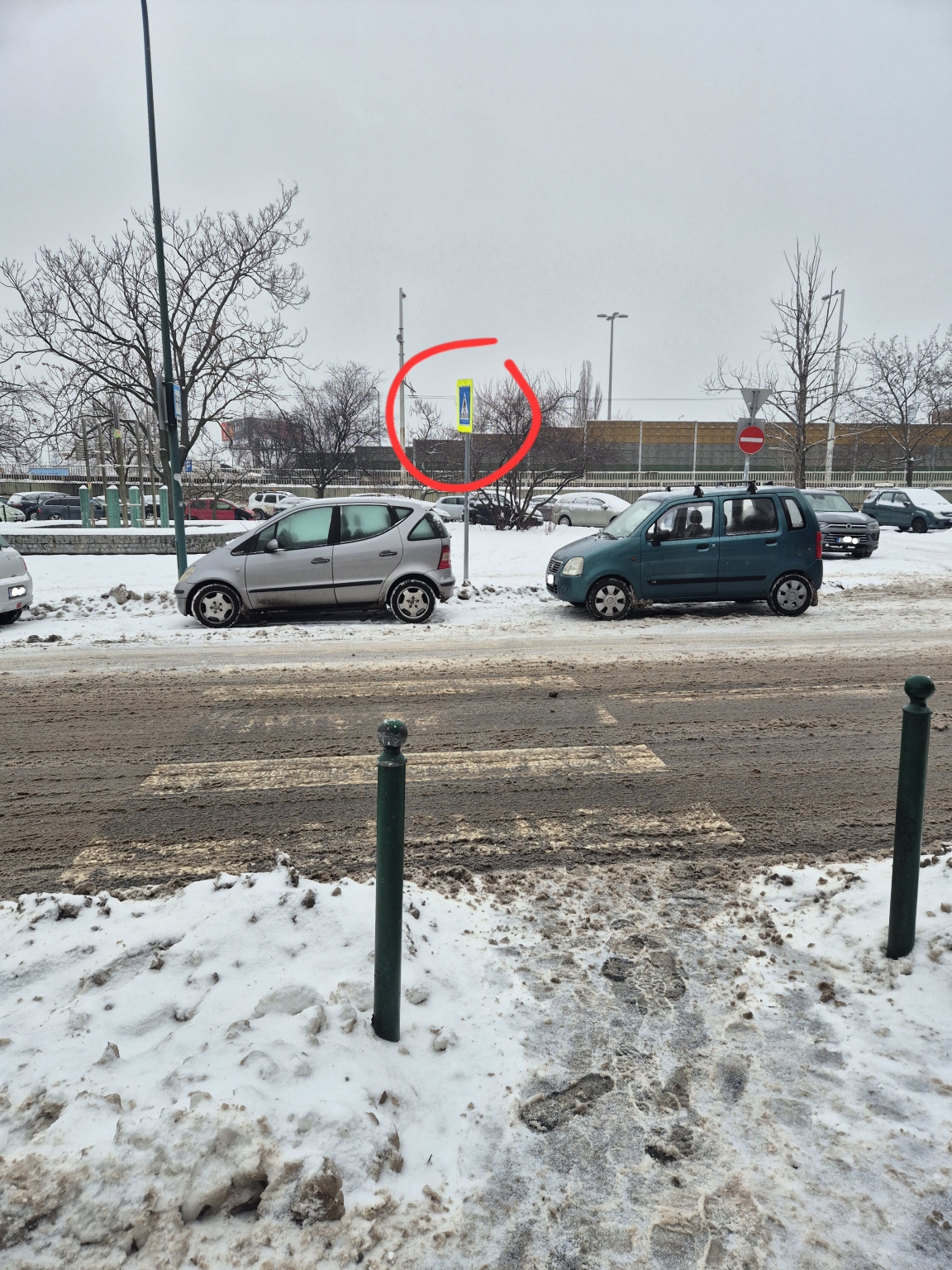 A gyalogátkelőhely egyik táblája 180°os fordulatot vett, ezzel sikerül is megzavarnia néhány autóst aki így a gyalogátkelőn parkolnak. Érdemes lenne visszaforgatni.
