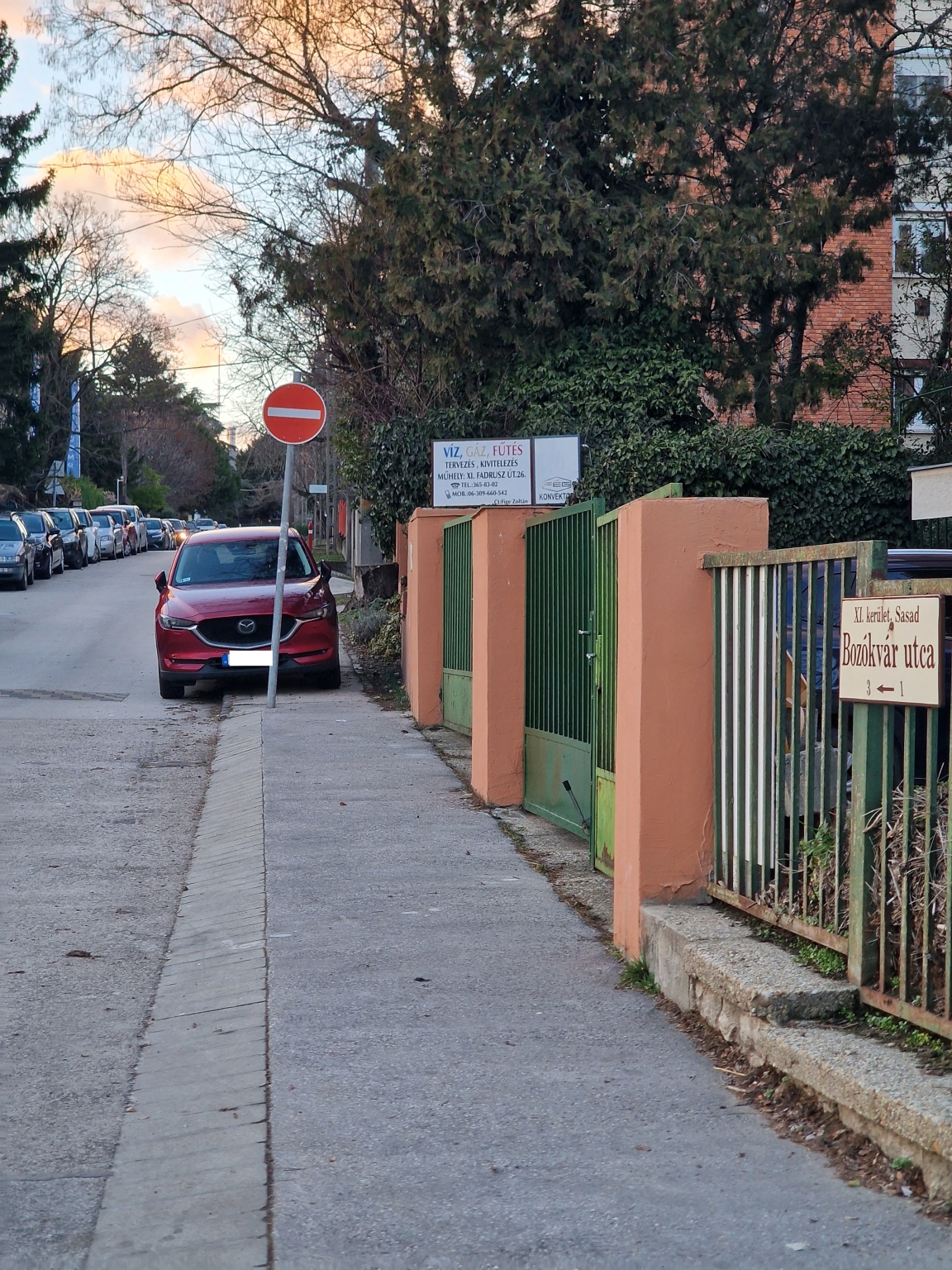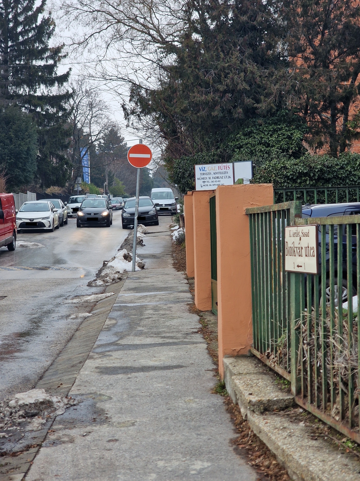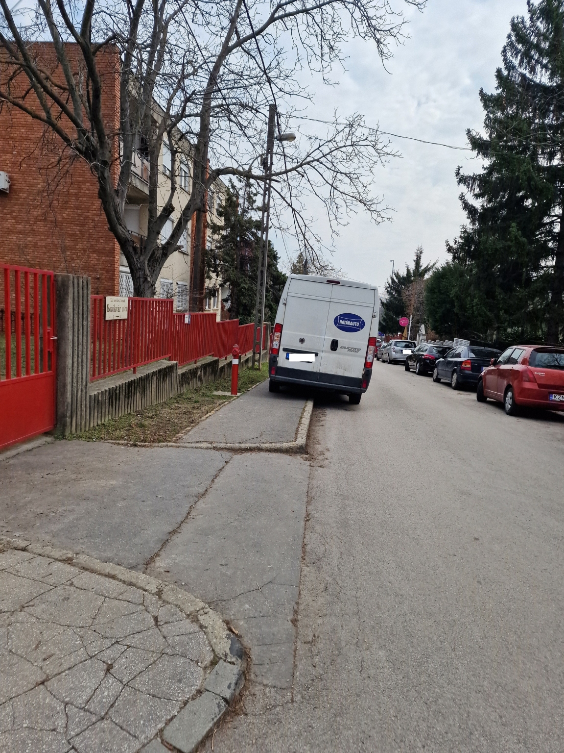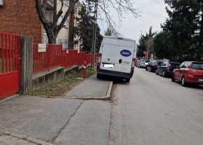 A Bozókvár utca 1-3. előtt nem lehet a járdát használni, mert az autók rendszeresen 2-4 kerékkel a járdán várakoznak.