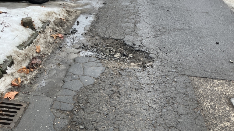 Hatalmas kátyú IV. kerületben Attila - Vécsey Károly utca sarkán.