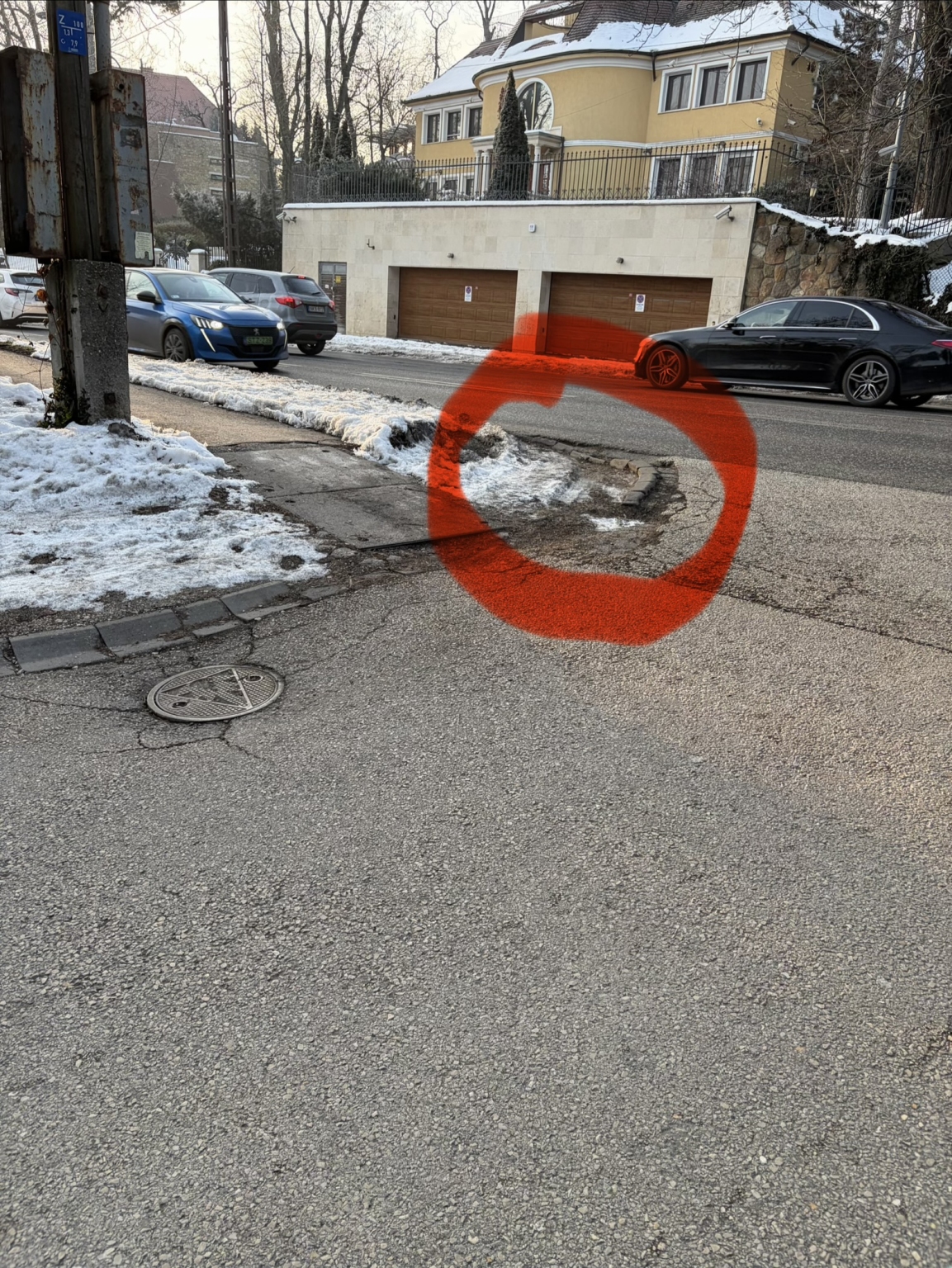 A Hűvösvölgyi útról az Ötvös János utcába kanyarodásnál az útburkolat megsüllyedt, huppanó van, javításra szorul.