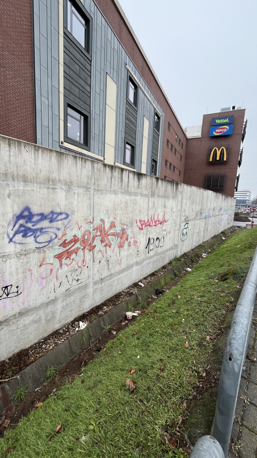 A KÖKI pláza oldalát graffitivel beszennyezték a Felüljáró oldalán. Kérem a takarítását, köszönöm!
