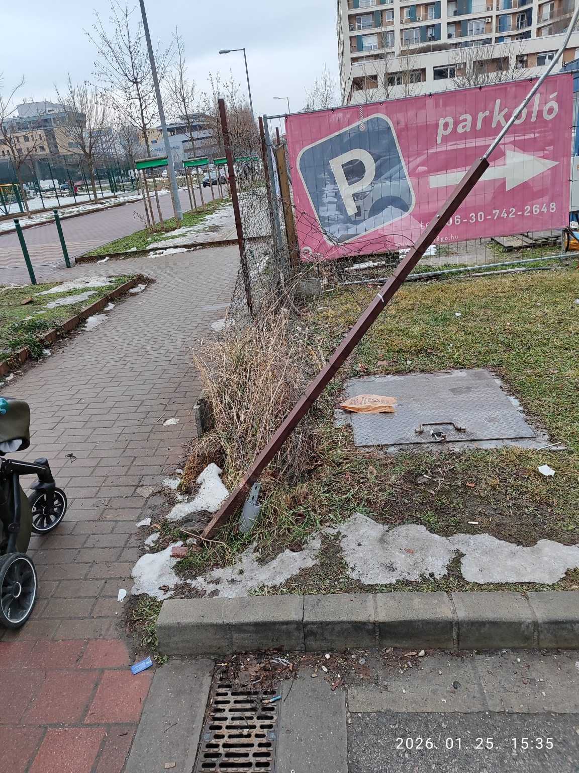 A kerítés rá van dőlve a járdára