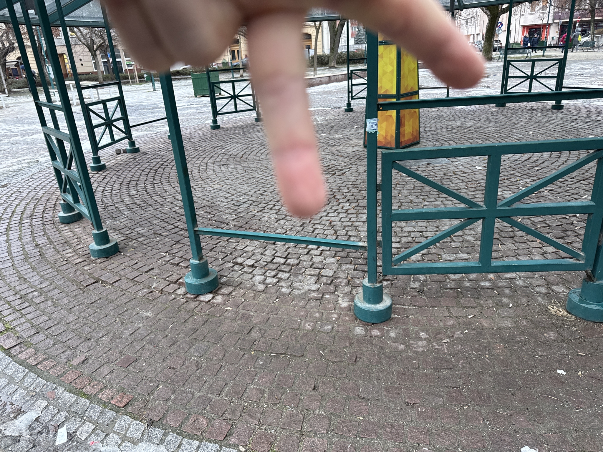9. Kerület, Ferenc téri pavilon alatt hiányoznak a deszkák. Jó volt ülni, könyökölni, stb.