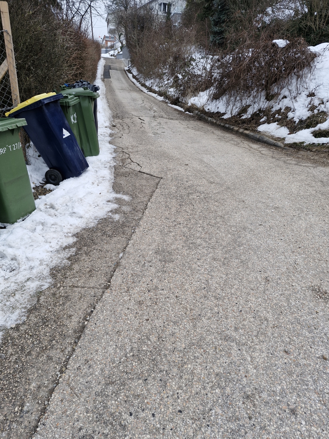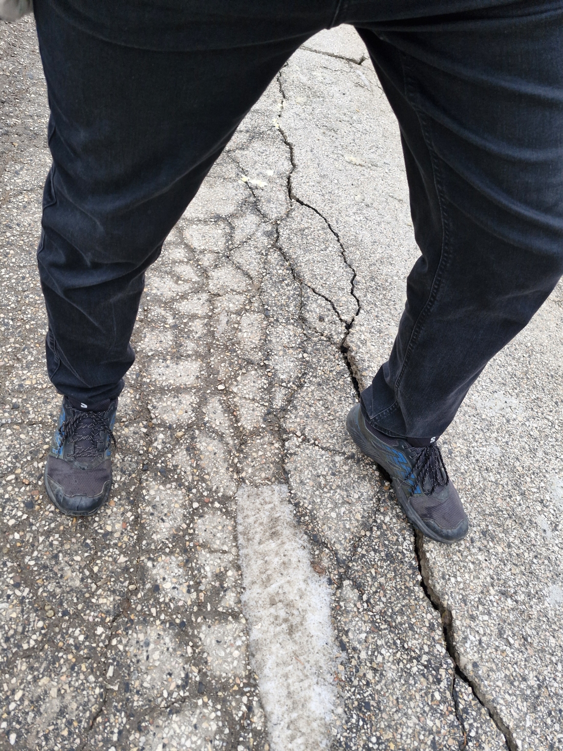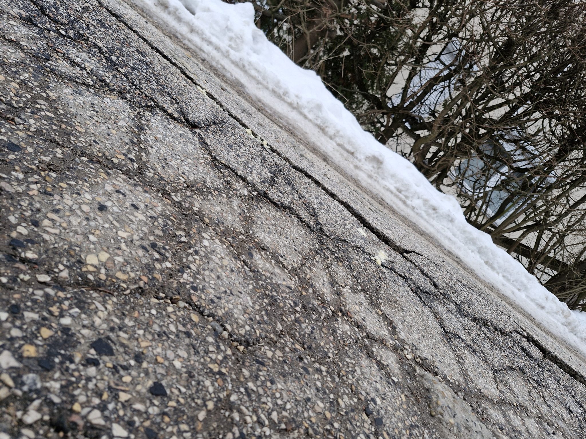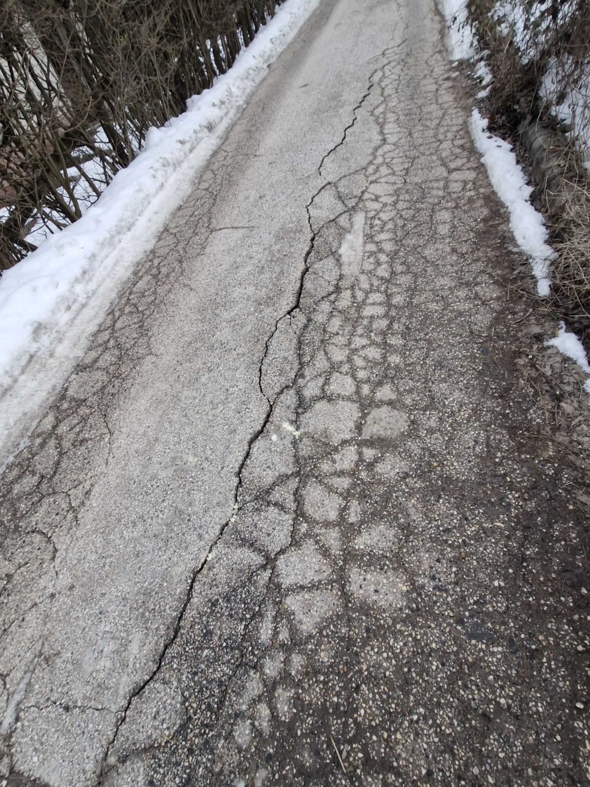 Az egysávos úttest két nyomvonala annyira megsüllyedt, hogy a kocsi alja leér a magasan fekvő középső részen.