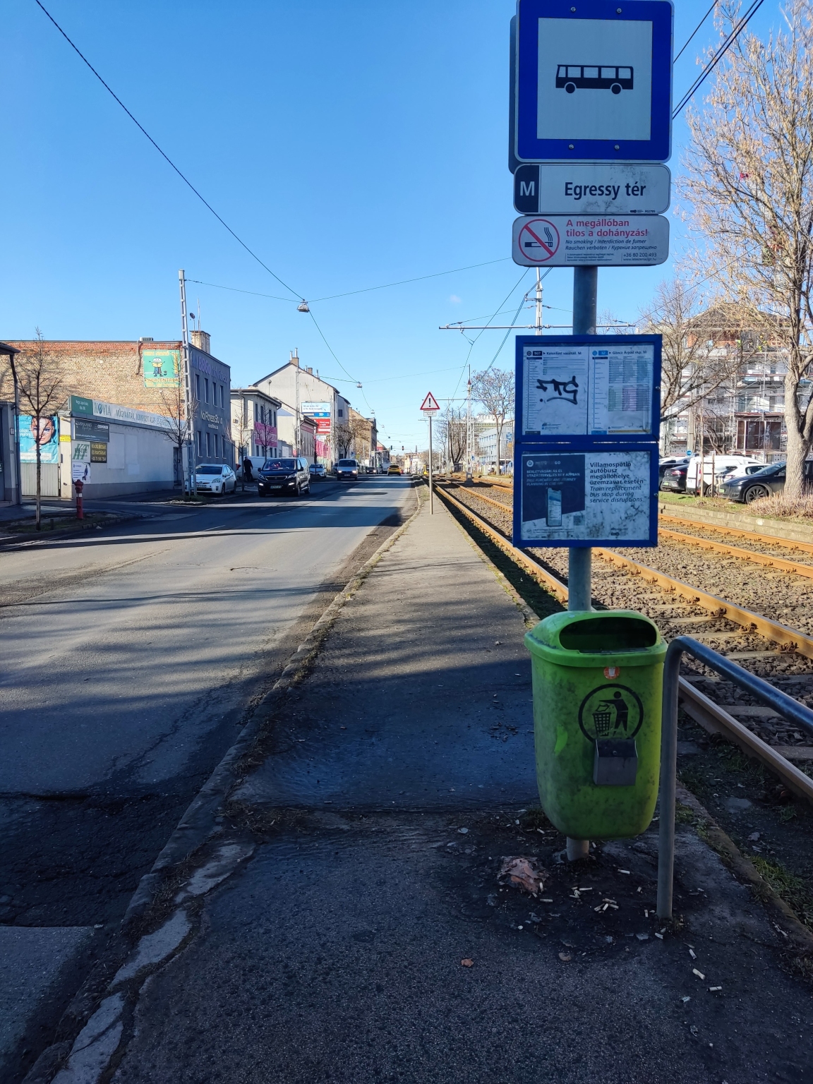 Kiégett szemetes maradványa és szemét a buszmegállóban.
