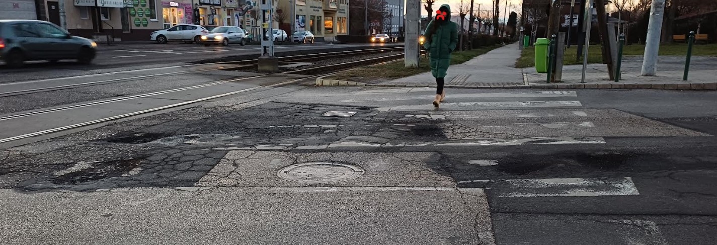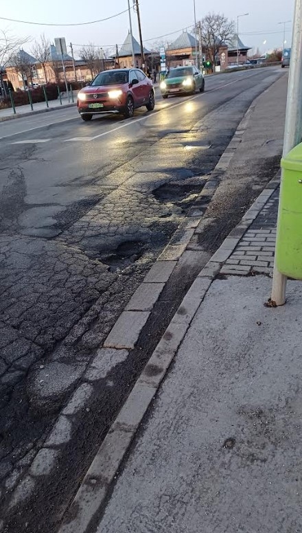 A Haladás utcai gyalogátkelő környékén több kátyú van, egy pár közvetlenül a rendőrség melletti buszmegállónál, ezeken keresztül állnak be a buszok a megállóba.