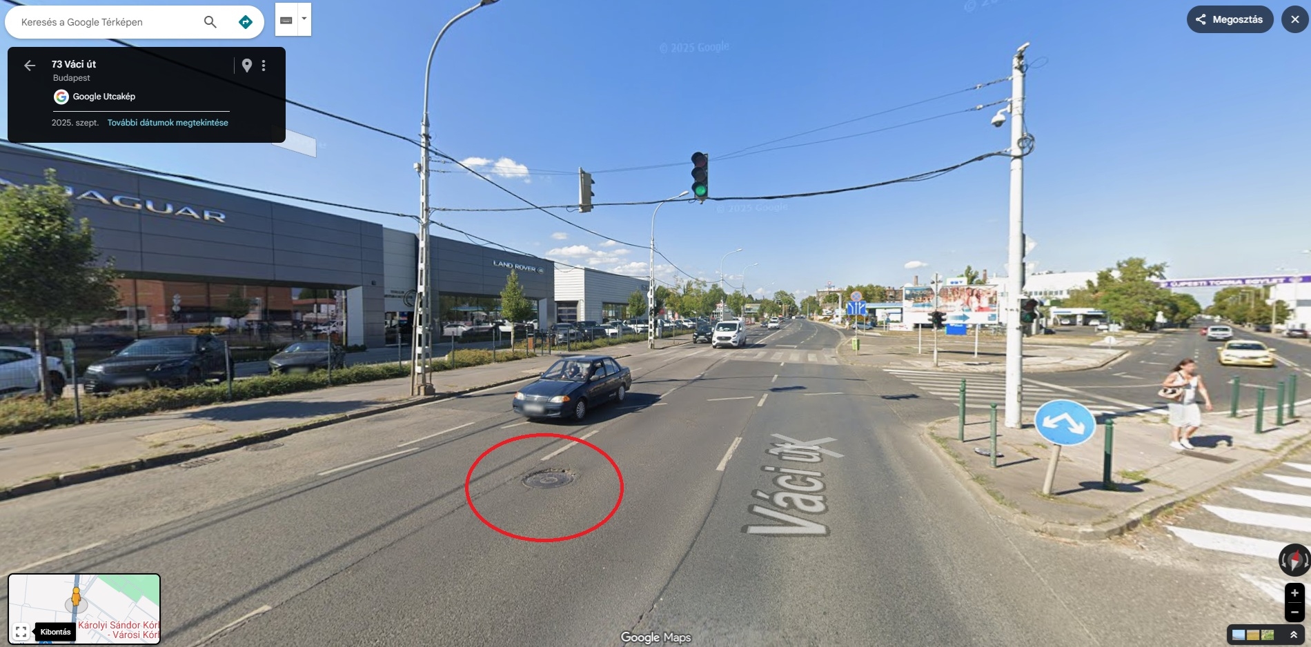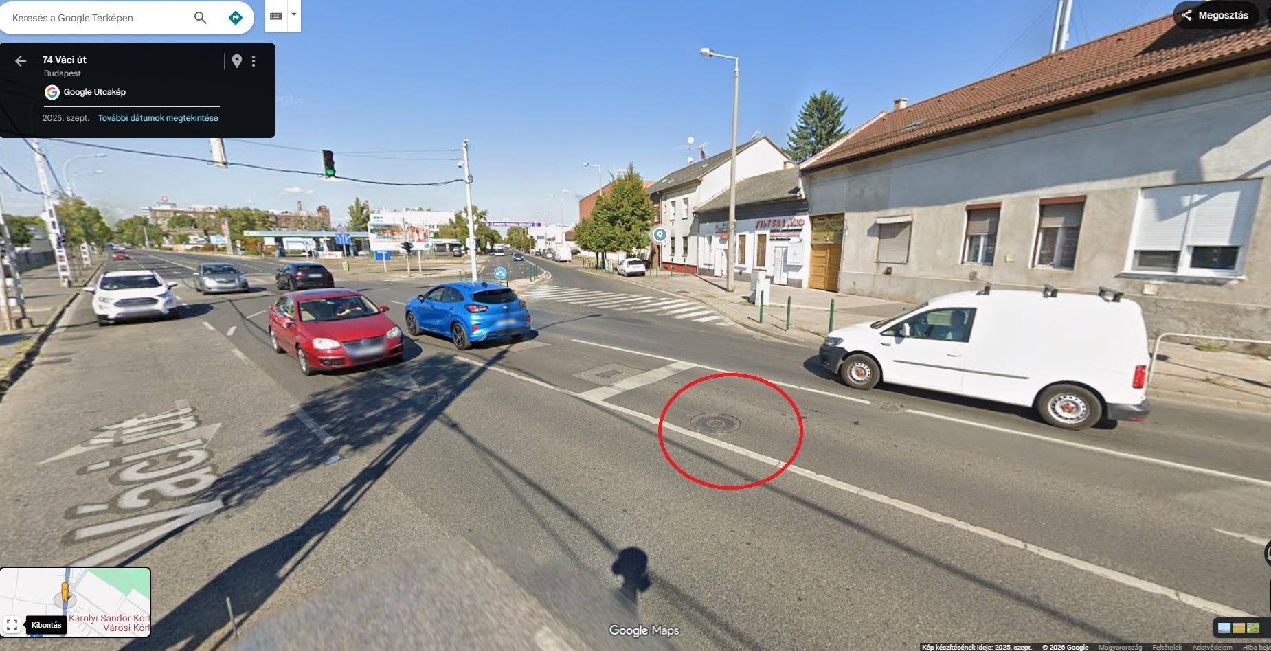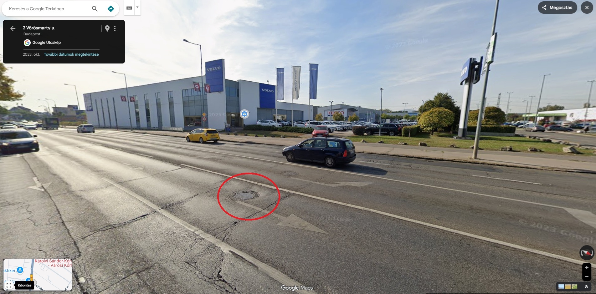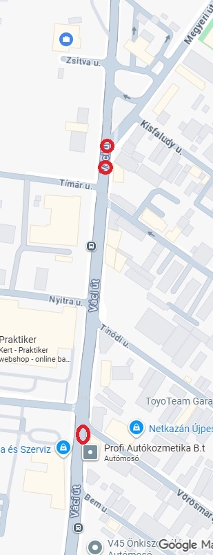 A képeken láthatóak a helyszinek, ahol piros karikával jelölve van a megsülyedt csatornafedő.