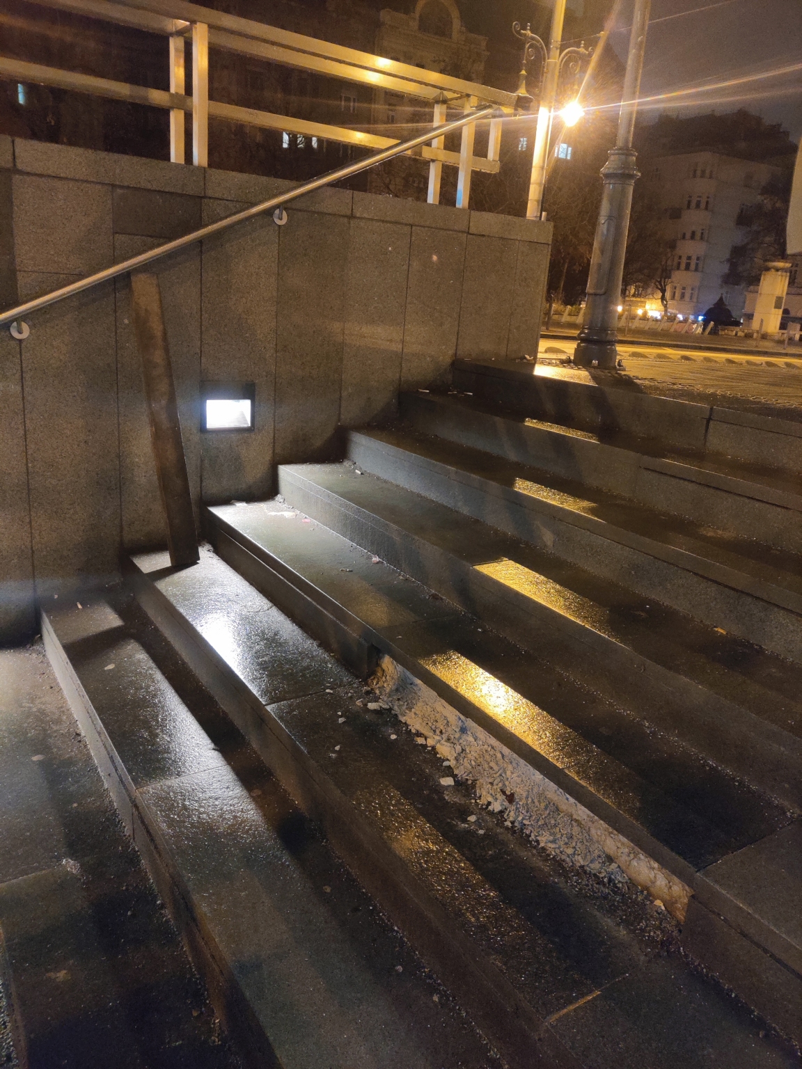 A fővám téri villamos aluljáró peronra vezető lépcsője szétesőben van, egy homloklap már le is esett és félretéve áll.