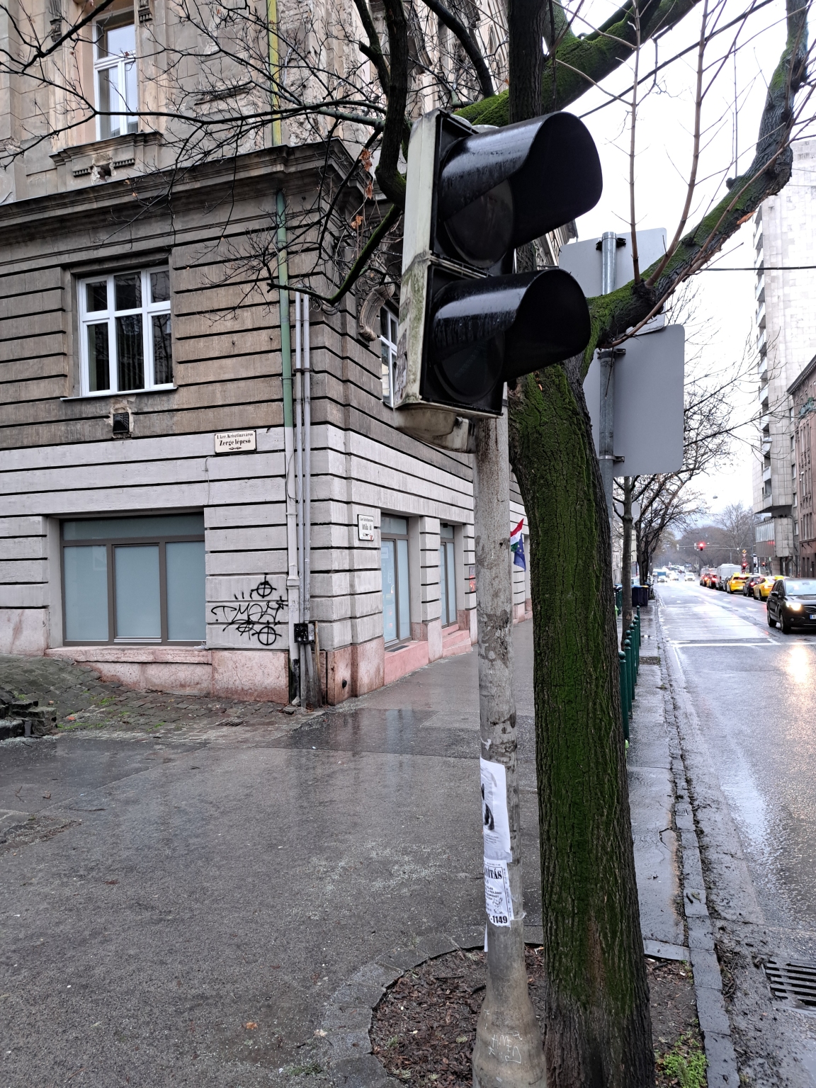 A BP. I. kerület Attila út és Roham utca kereszteződésében nem ég zöld a gyalogátjelő lámpaja egyik oldalon sem