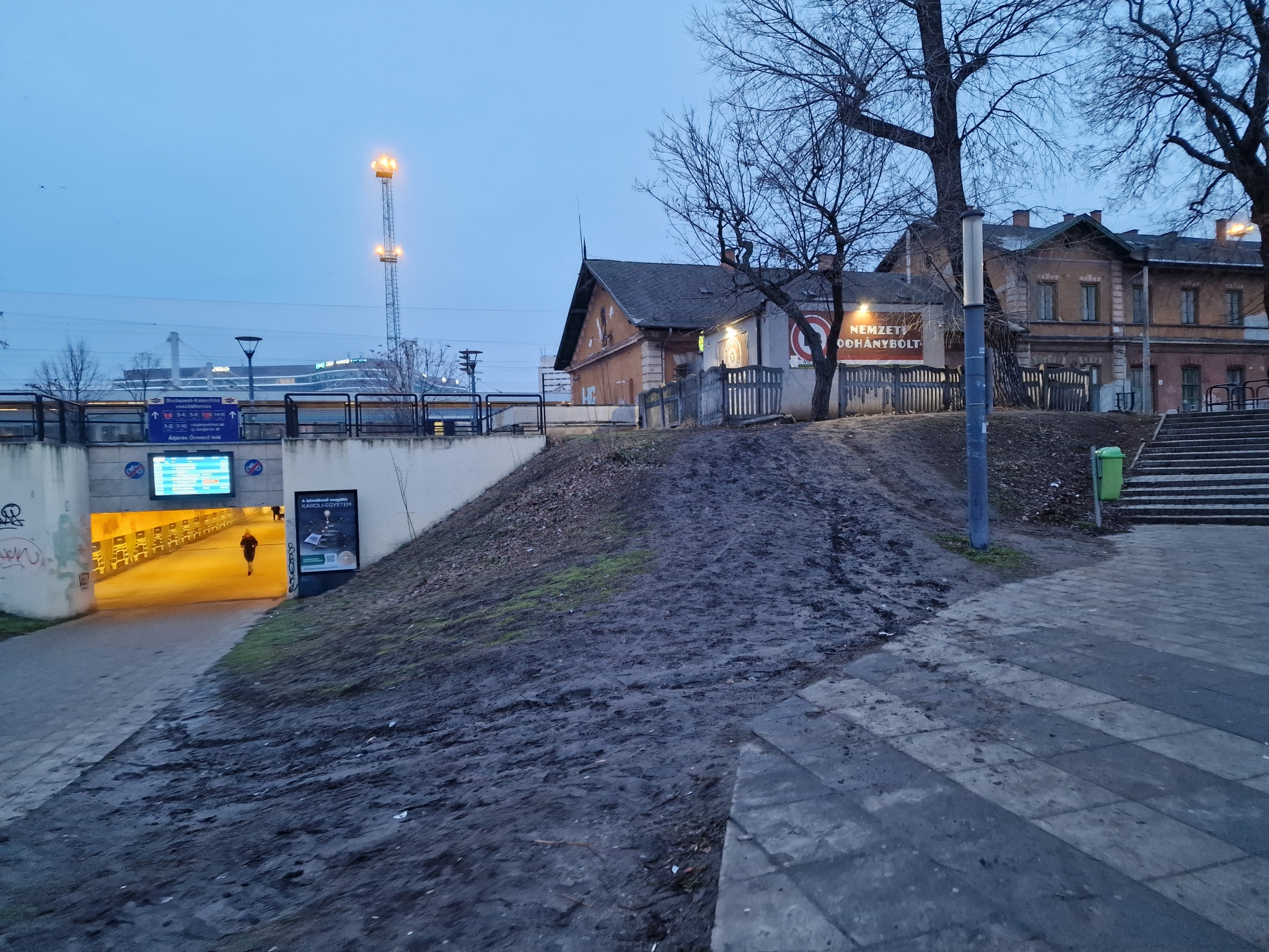 Az Etele téren a régi gyalogos aluljárónál a lépcső mellett rendszeresen kitapossák a füves lejtőt. Jelenleg tiszta sár minden. Szeretném kérni, hogy a terület legyen kerítéssel, vagy bokrokkal körülvéve, hogy ne legyen átjárás és füvesítsék újra a területet. Valószínűleg hasznos lenne a lépcső mellé egy akadálymentes rámpát kialakítani, illetve az sem ártana, ha az 1-es peronhoz vezető lépcsőt megnyitnák a gyalogosok számára.