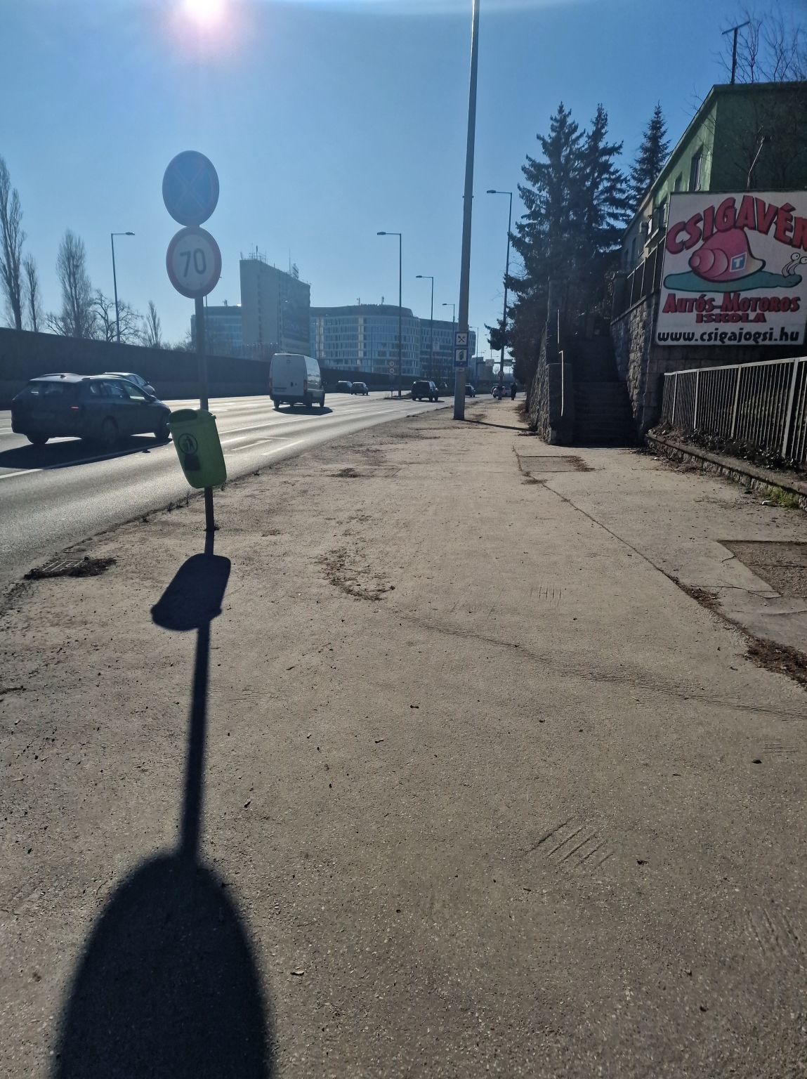 A Budaörsi út 107-111. előtti járda takarítását szeretném kérni Újbuda Prizmás utcaseprő géppel, mert a nyolcsávos útról, ahol 70 km/h-val közlekednek az autók, a szél az összes szemetet, port, falevelet odahordja a kb. négy méter széles, 100 méter hosszú járdán. Az ott lakóktól nem lehet elvárni, hogy egy 400 négyzetméteres járdaszakaszt takarítsanak, ahová a forgalmas útról folyamatosan odafújja a szél az újjab port és szemetet. Egy km-re található innen az Újbuda Prizma és még soha az életben nem láttam, hogy erre jártak volna az utcaseprő géppel. Évek óta így néz ki ez a járda, néha a Közút vagy az FKF a sokadik megkeresésre összelapátolja legalább a falevelet.