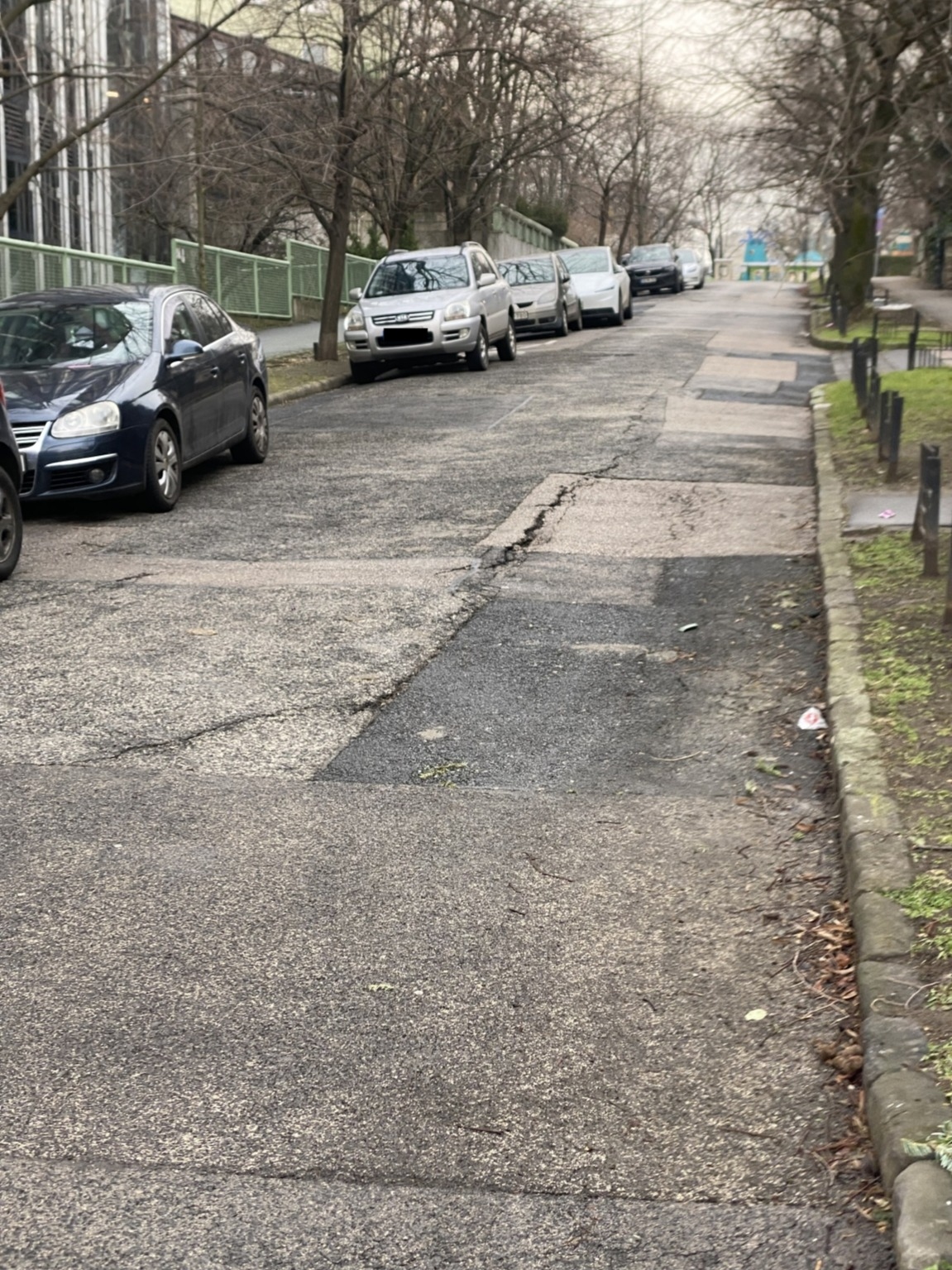 Kérem javítsák ki ezt az utcát és az utcának a Lisznyai utca lefele menő ágával kereszteződő, besüllyedt járdafelületét, ami most úgy néz ki mintha kerekes székeseknek találták volna ki, de alapvetően ezt a betonkeverők rombolása okozta.