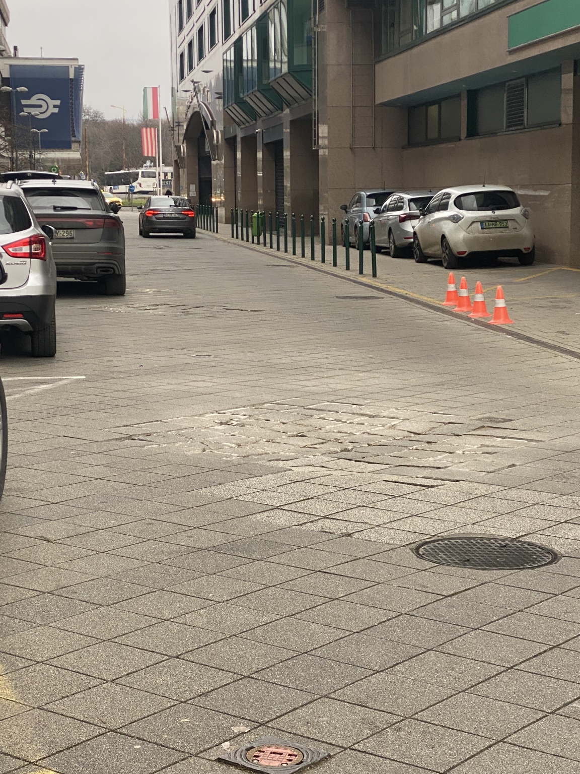 Pályaudvar és irodaház közötti utcaszakaszba bekanyarodva romra van törve a térkő üttest!