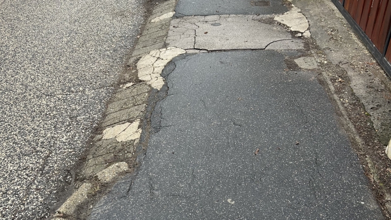 A járda es az autófelhajtó repedezett / törött, a járda alatti csövek (gáz) nyomvonala megsüllyedt, a szakasz javítását kérem. (12. kerület racz aladar ut 64