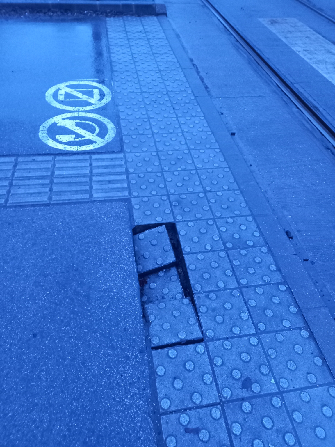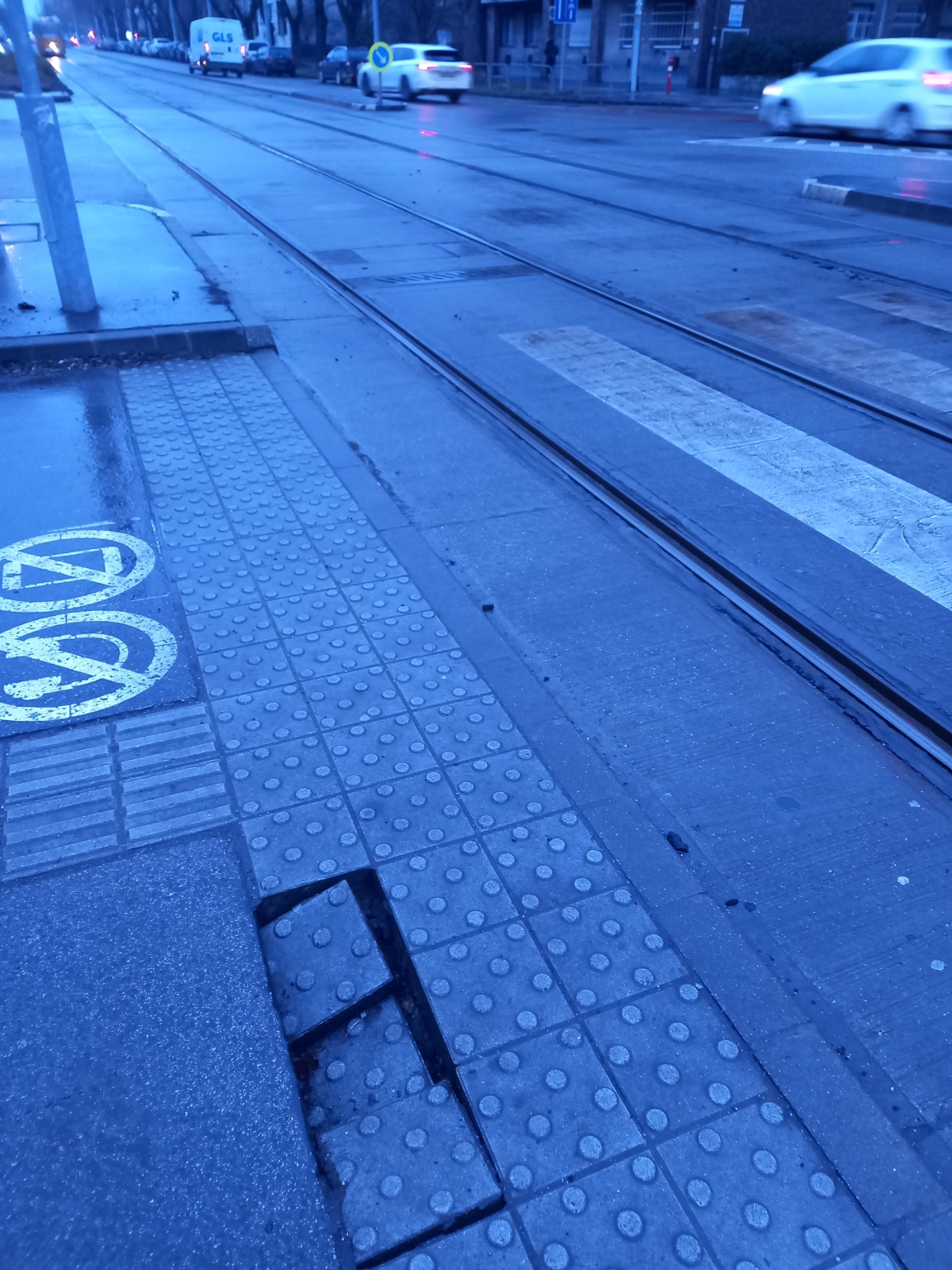 Hiányzó térkő, a villamosmegállóban a zebra részén elmozdult, beszakadt 2 térkő. Forgalmas helyen, balesetveszélyes
