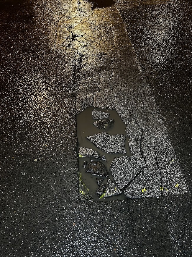 Újpalotai út elején az út közepén van egy nagyméretű kátyú, ami még tovább fog nőni, mivel már több kisebb kockára széttöredezett egy korábbi javítás felülete.