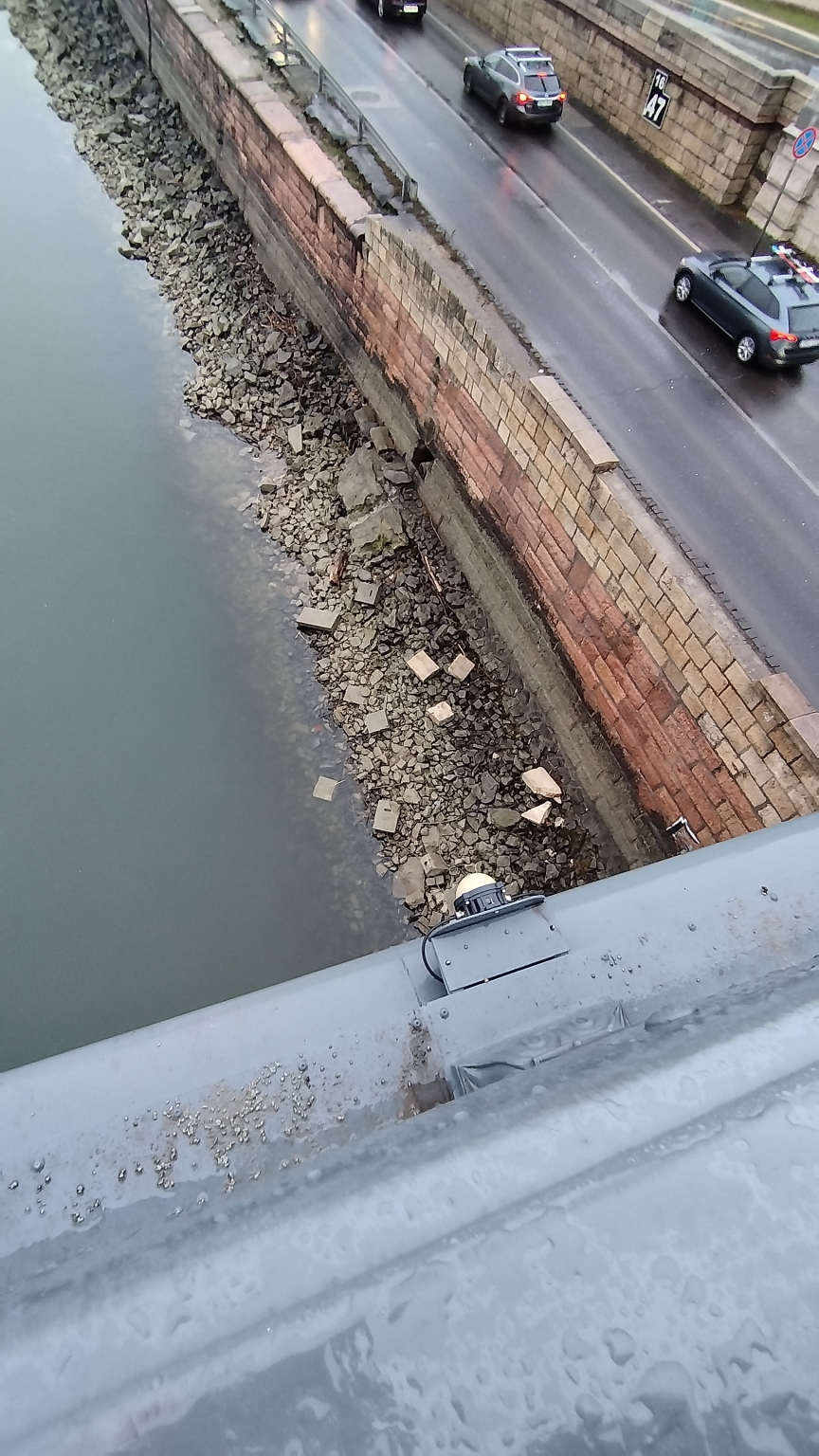 A jelzett helyen az alsó rakparti útnak a Duna-meder felőli oldalán lévő mellvéd-fal tetőkövei rendre le vannak potyogva a Dunába. Jelenleg alacsony vízállásnál szépen láthatóak.