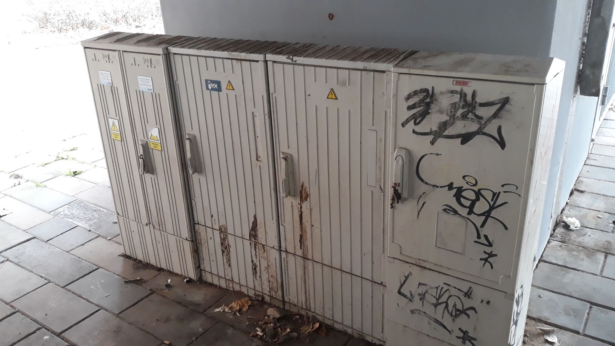 Úgy látszik a "probléma" pillérről pillérre vándorol. Vélelmezhetően újra emberi ürülék van, most egy másik pillérnél, illetve az előtte lévő elektromos (?) szekrényen. Ne feletkezzünk meg a graffitiről sem.
