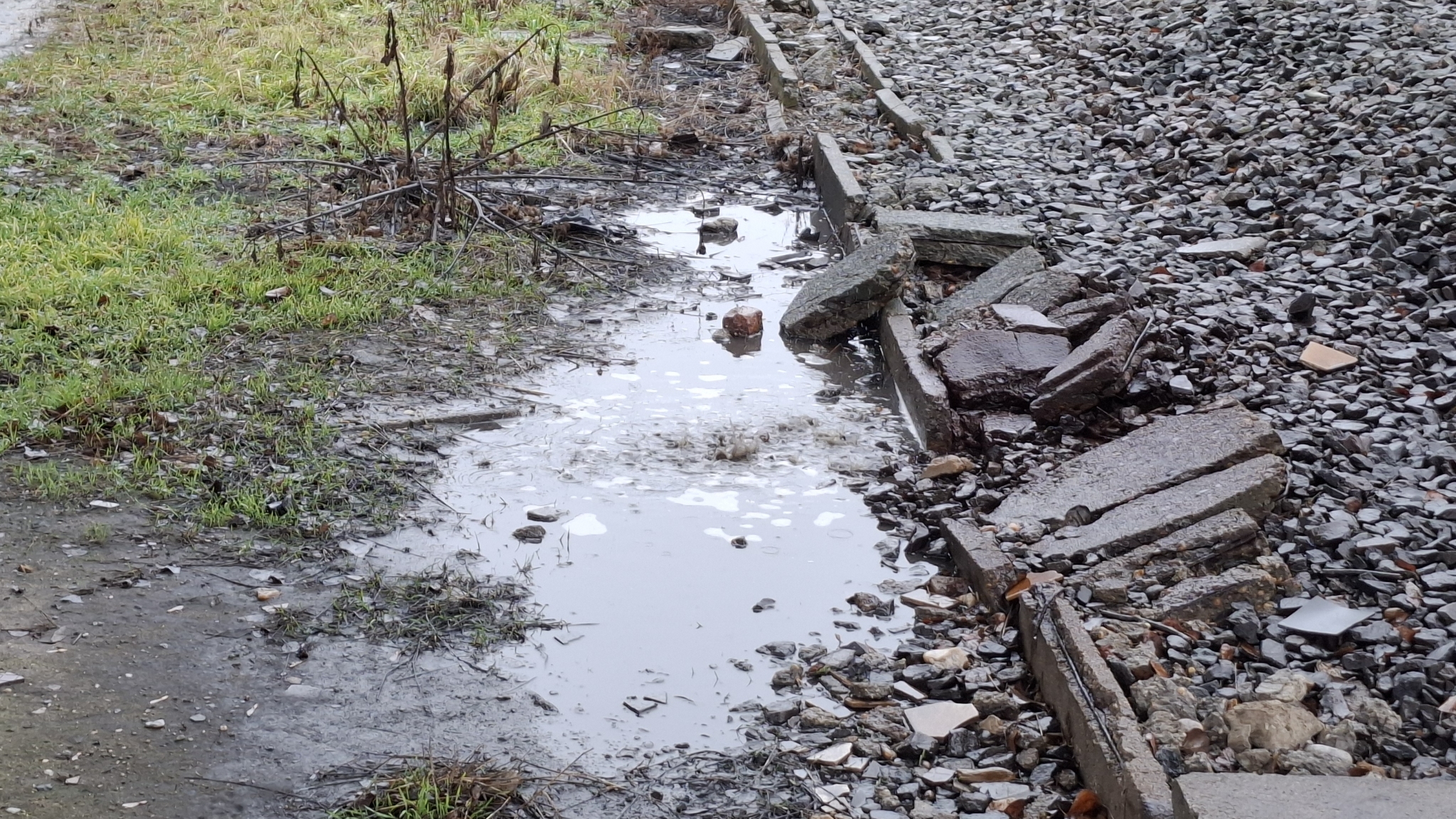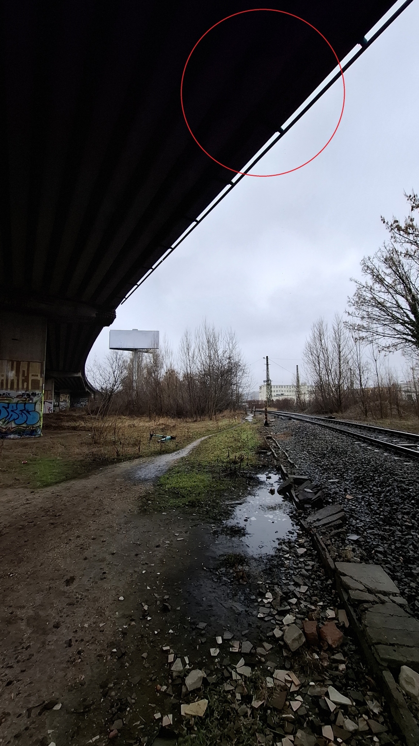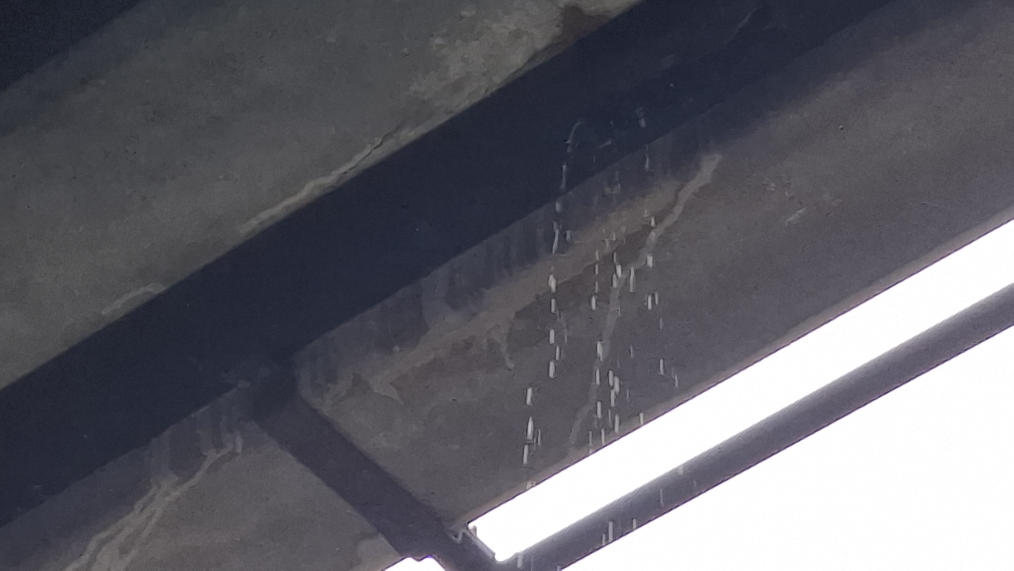 A képeken látható dugulás / folyás minden bizonnyal nem újkeletű, mert a felüljáró érintett beton anyagában már látszik a kilugzás.