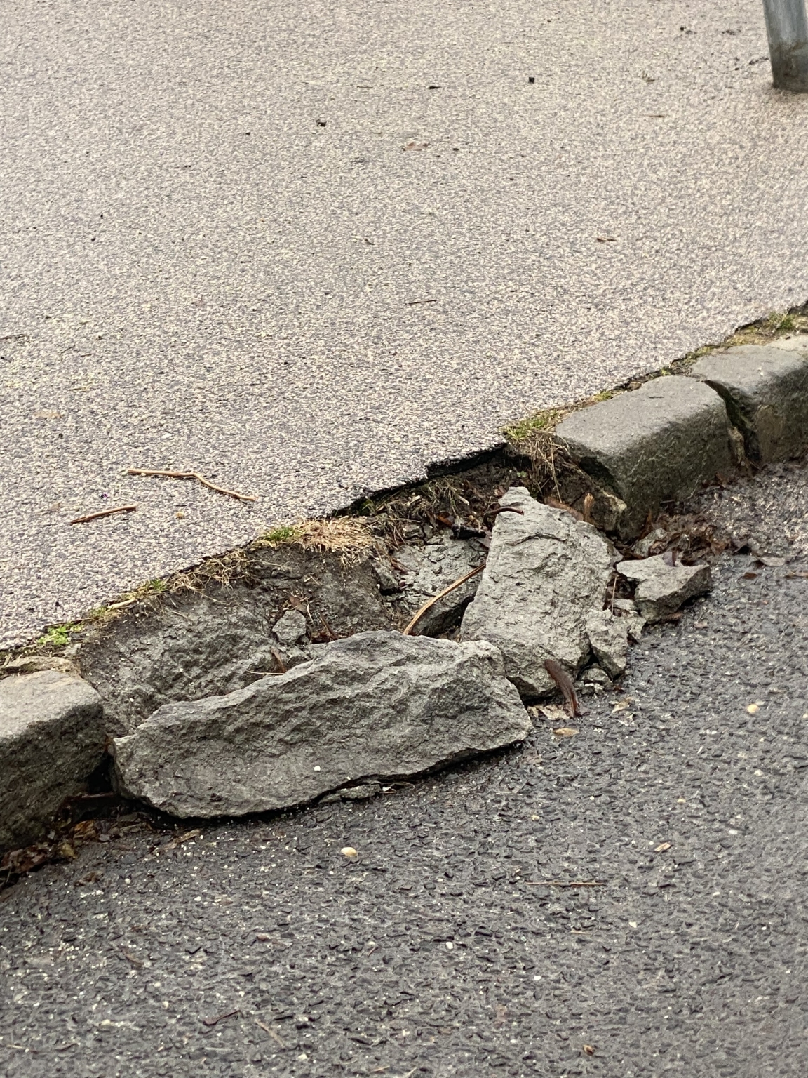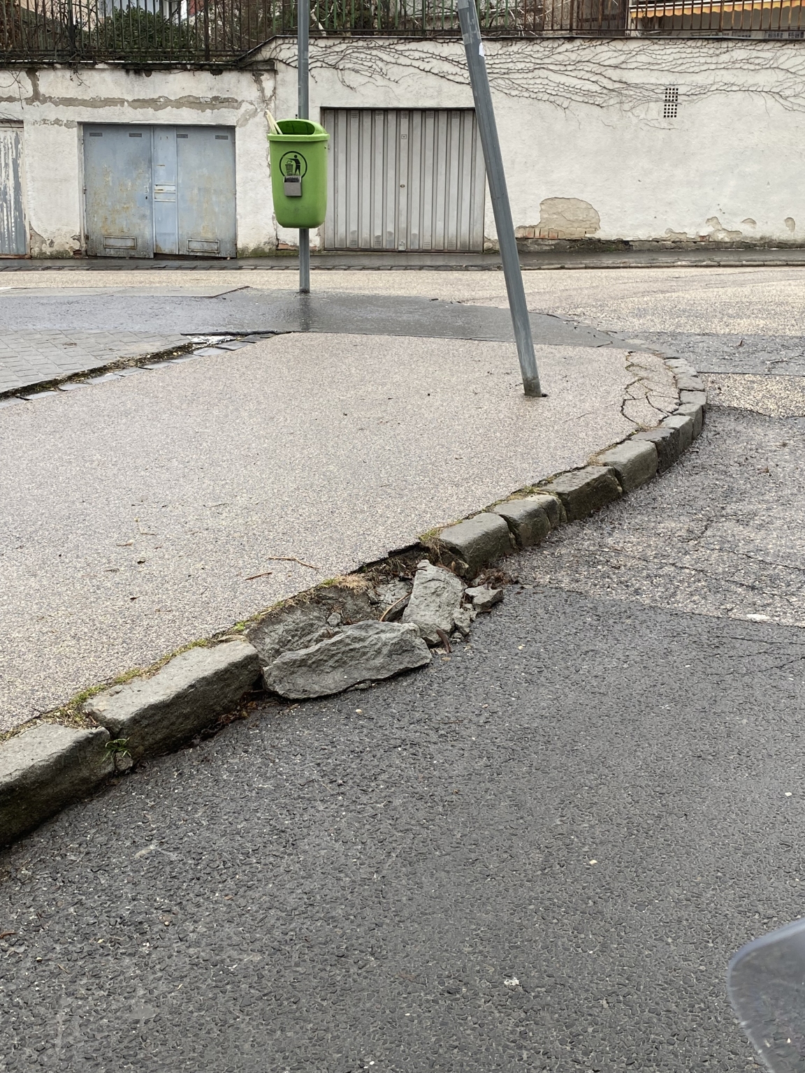 Fém utcában egyik percről a másikra kiszakadt a vaskos kőpadkákből két, ránézésre egyenként több tíz kilós darab. A kiszakadt részek az úton hevernek